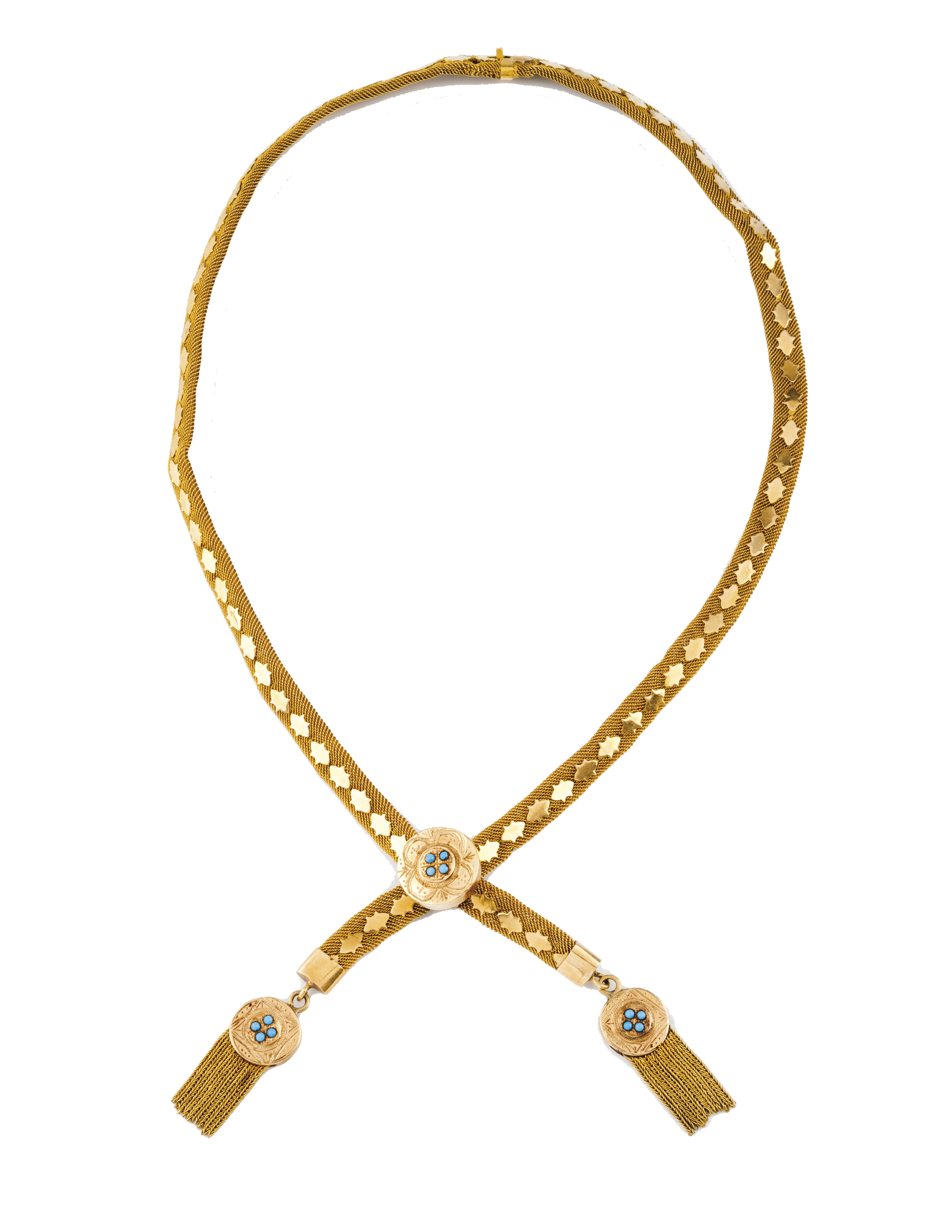 Com passador central cinzelado cravejado com microturquesas e fitas com remates idênticos e franjas