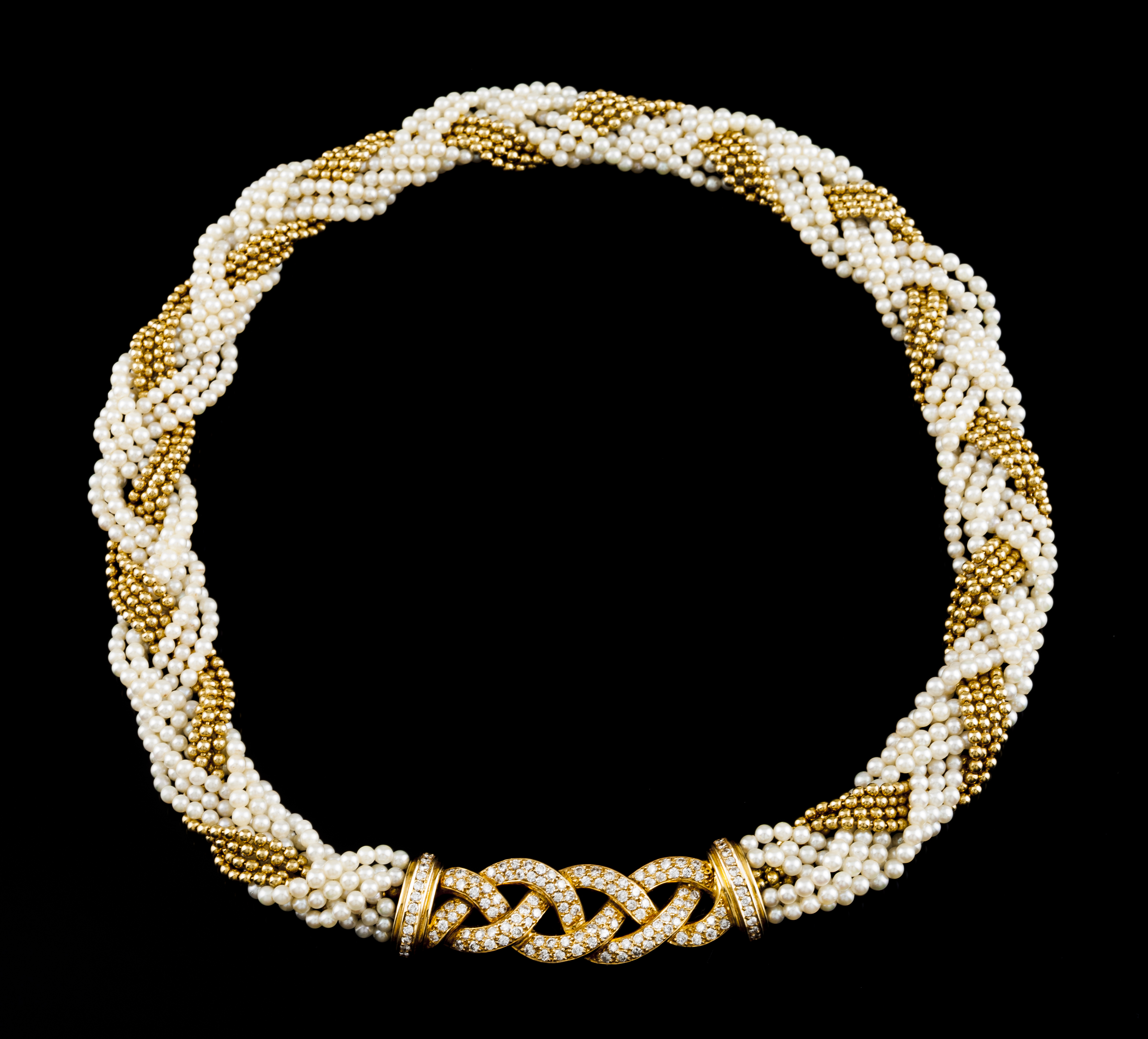 Composto por torçade de pérolas de cultura, fiada de contas e centro em ouro