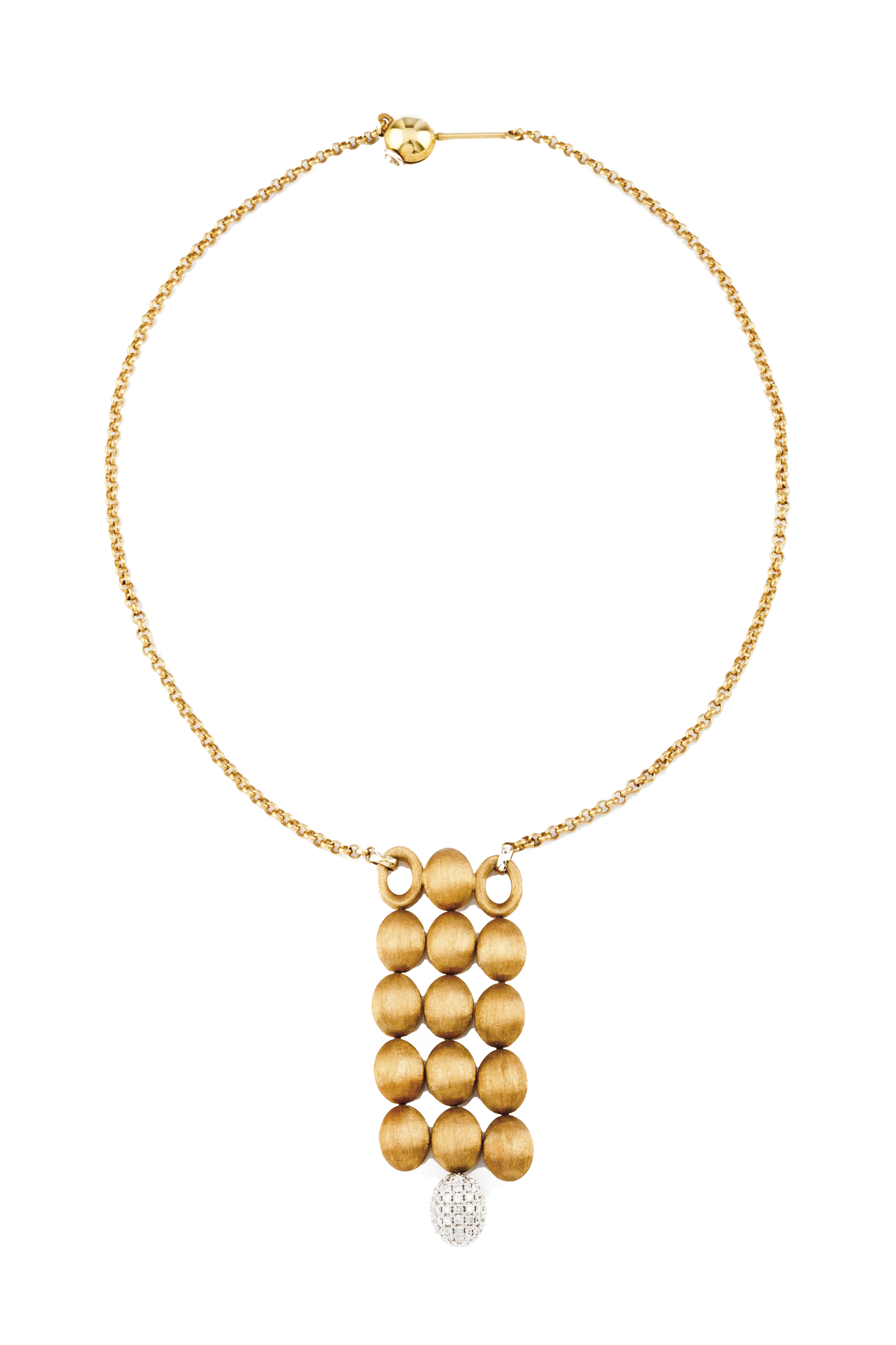 Com pendente formado por elementos escovados articulados sendo o da extremidade cravejado em pavé com diamantes em talhe de brilhante