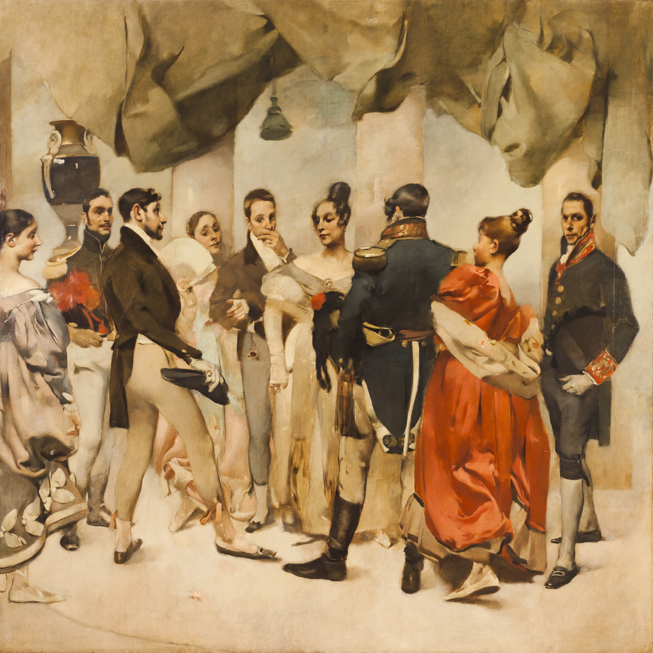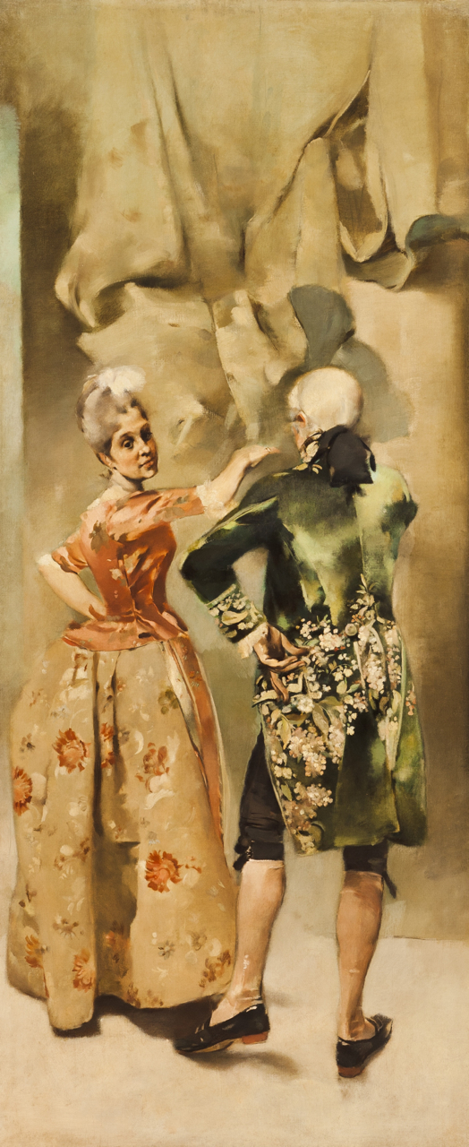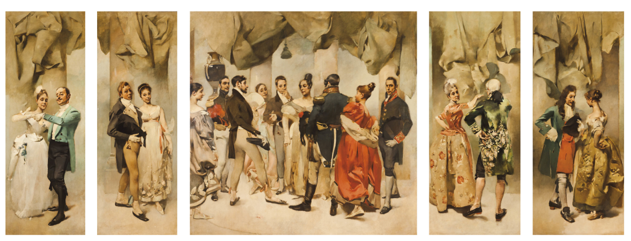 Magnífico conjunto representando a evolução da dança ao longo de diferentes épocas. Painel central com grupo de nove figuras trajadas de baile e quatro painéis mais pequenos com casais representando diferentes épocas, nomeadamente, a Belle Époque, o período Império, a época de Luís XV e por fim de Luís XIV.