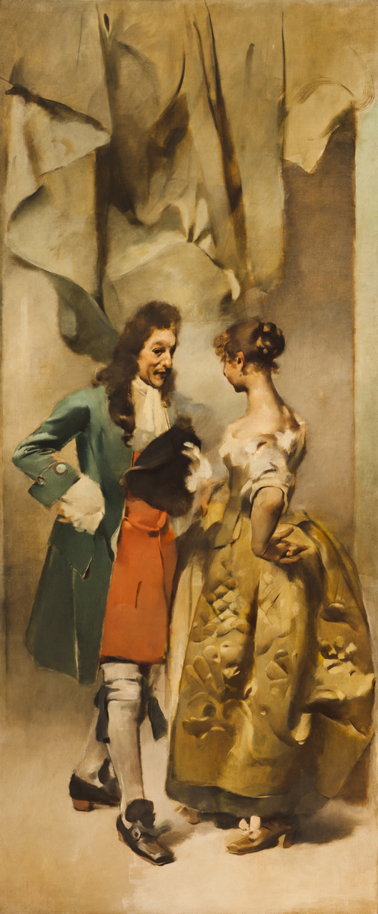 ) Quarto retábulo, Luis XIV. O costume de homem, severo, casaca azul e cabelleira danneis, canhões e bofes de renda, tricorne na mão esquerda, e o collete de grandes abas, cahindo, vermelho, té lhe encobrir as coxas de paralta. A figureta da mulher poisa a tres quartos, voltando de leve as costas a quem olha, e é a mesma anemia morena, o mesmo typo afusado e decadente das outras, com frescuras que lhe vem dos poucos anos, e nunca do circular sadio do bom sangue. (