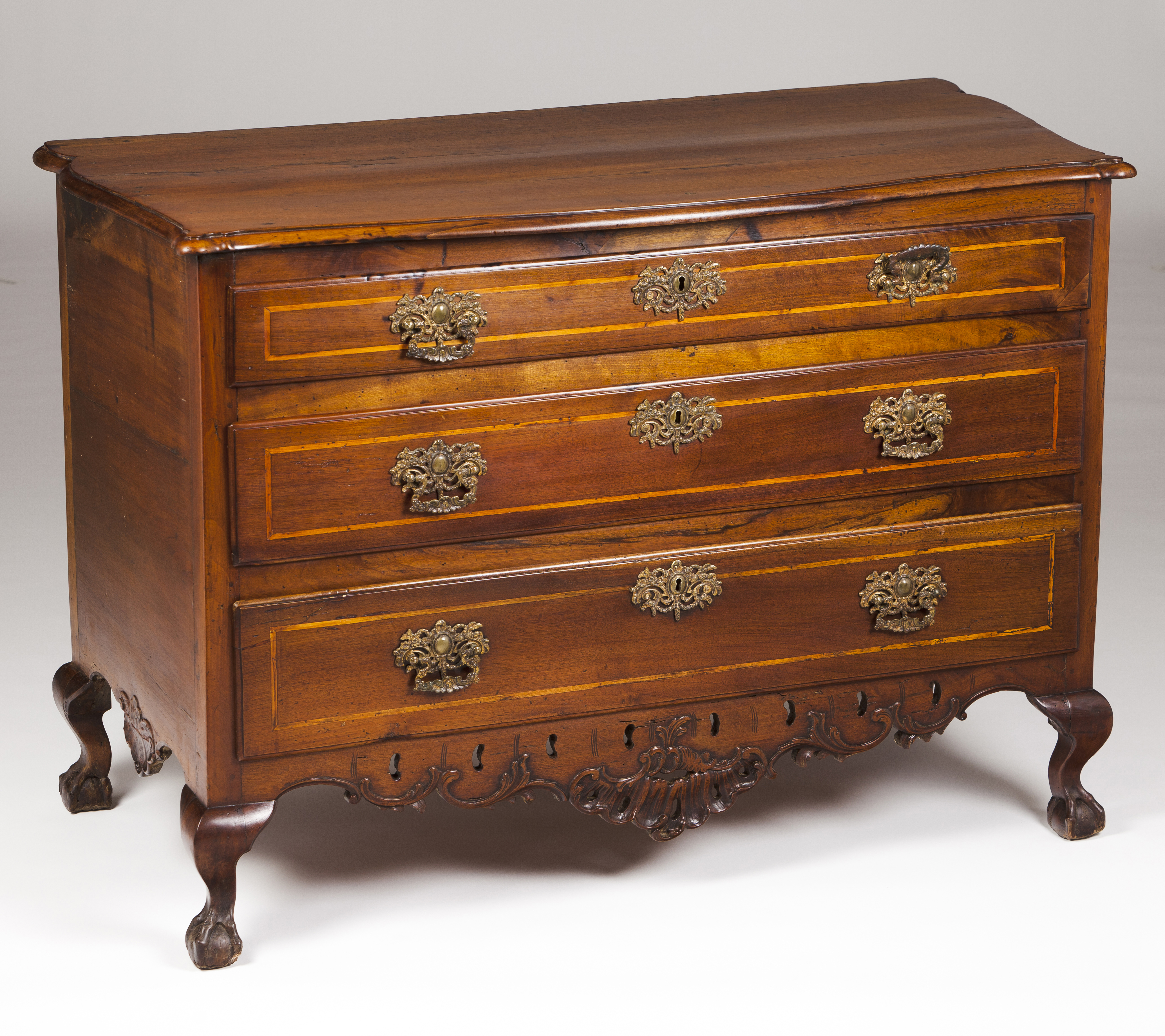 Com três gavetões e pés de garra e bola