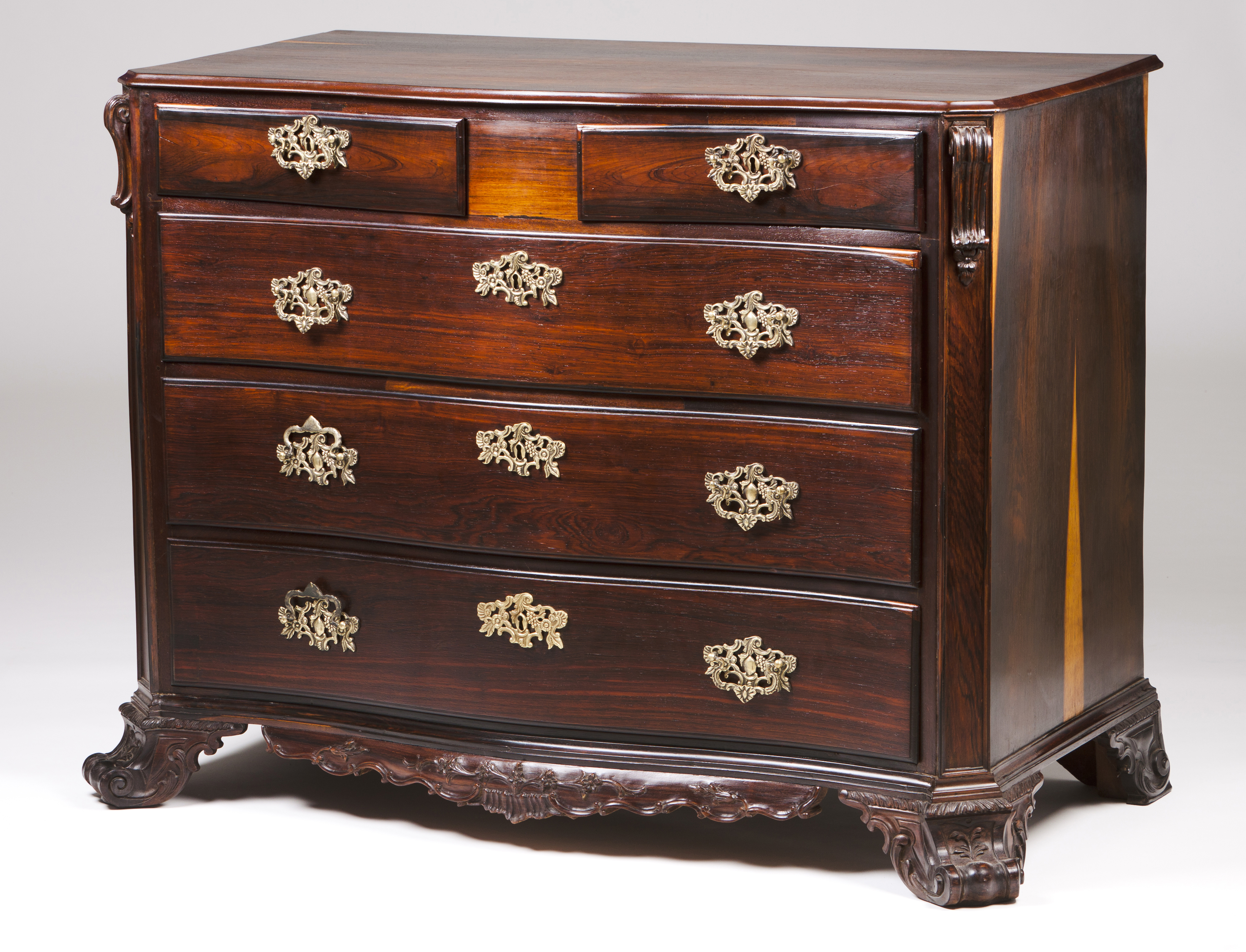 Em pau-santo com caixa em formato recortado, saias, pés e remates dos cantos entalhados