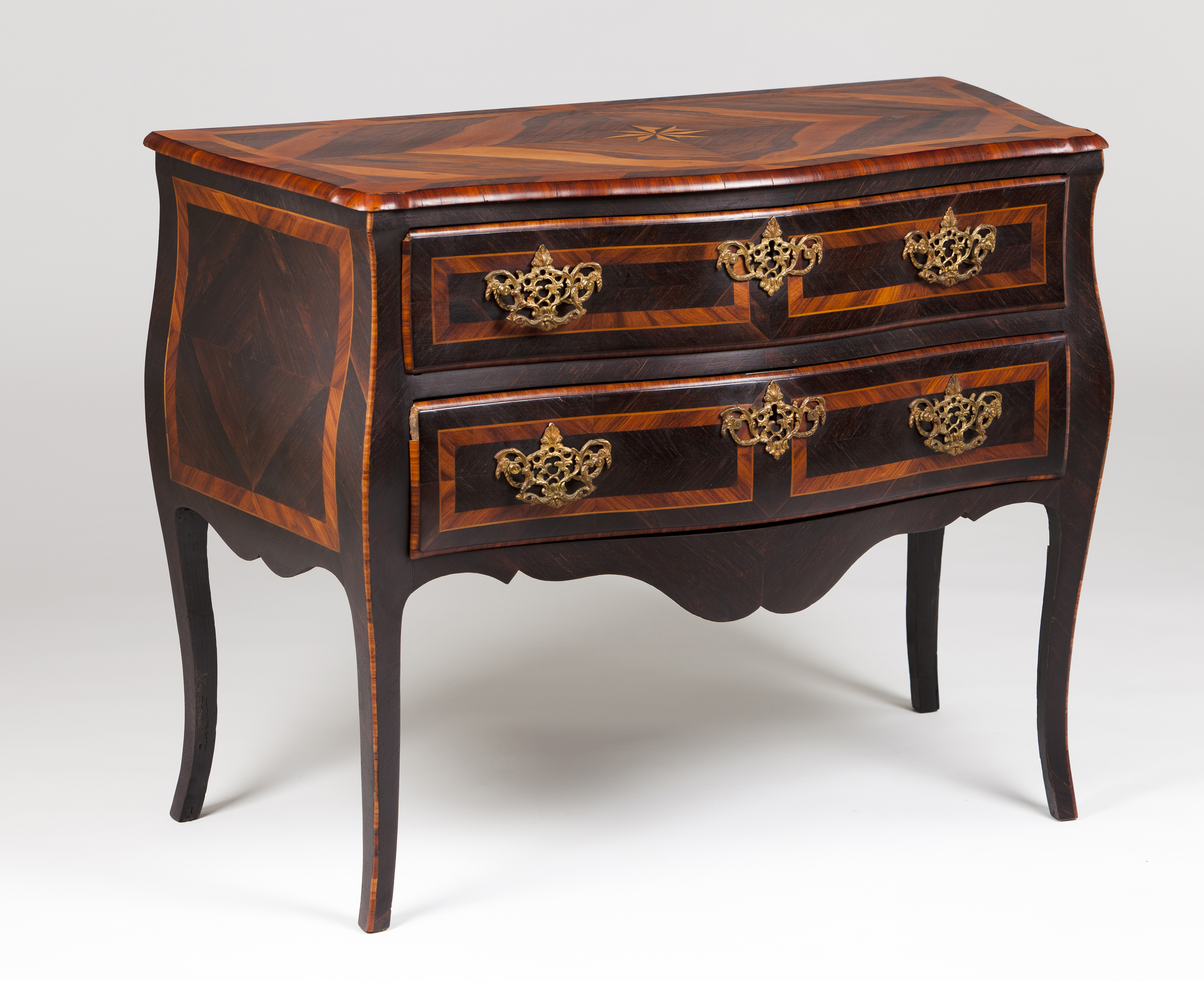 Em pau-santo, com trabalho de marchetaria em pau-santo, pau-rosa e outras madeiras