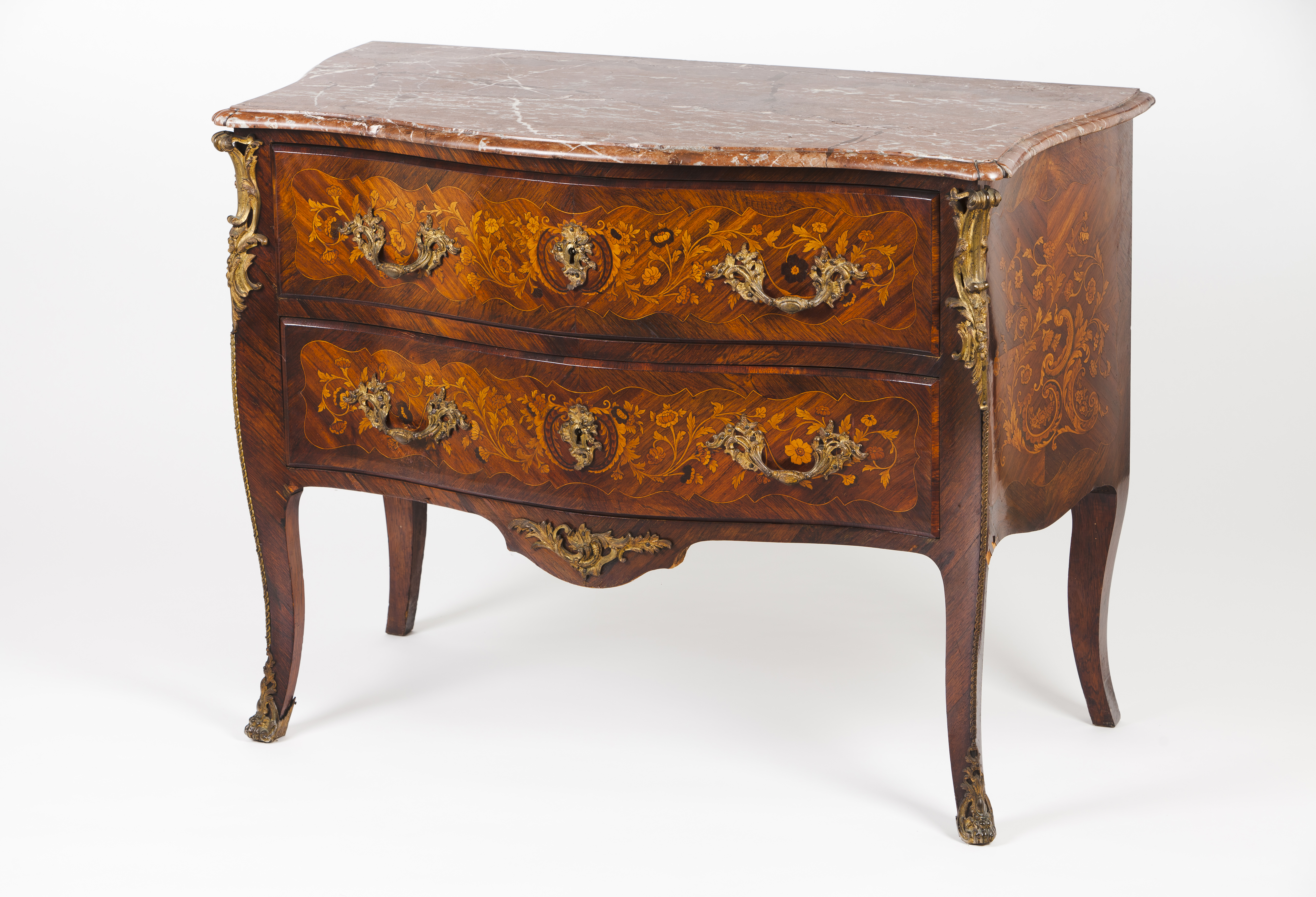 Decorada com trabalho de marchetaria em várias madeiras representando motivos florais