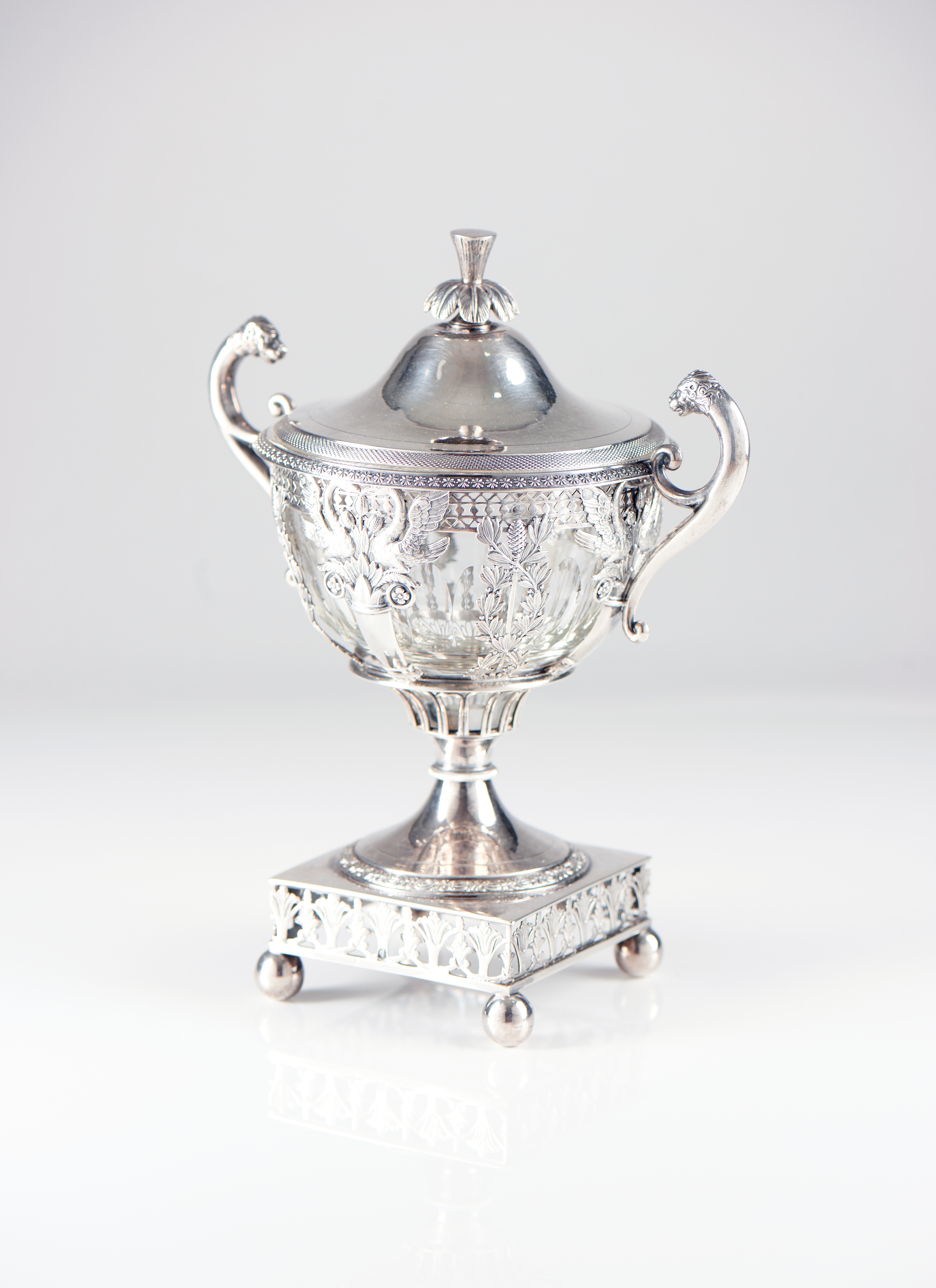 Fabricante Ambroise MIGNEROT, assente sobre pedestal com decoração vazada de cisnes afrontados alternando com tirsos, a base quadrada ornada com friso de lótus assente sobre quatro pés de bola. Pegas em cabeça de leão e pomo em pluma