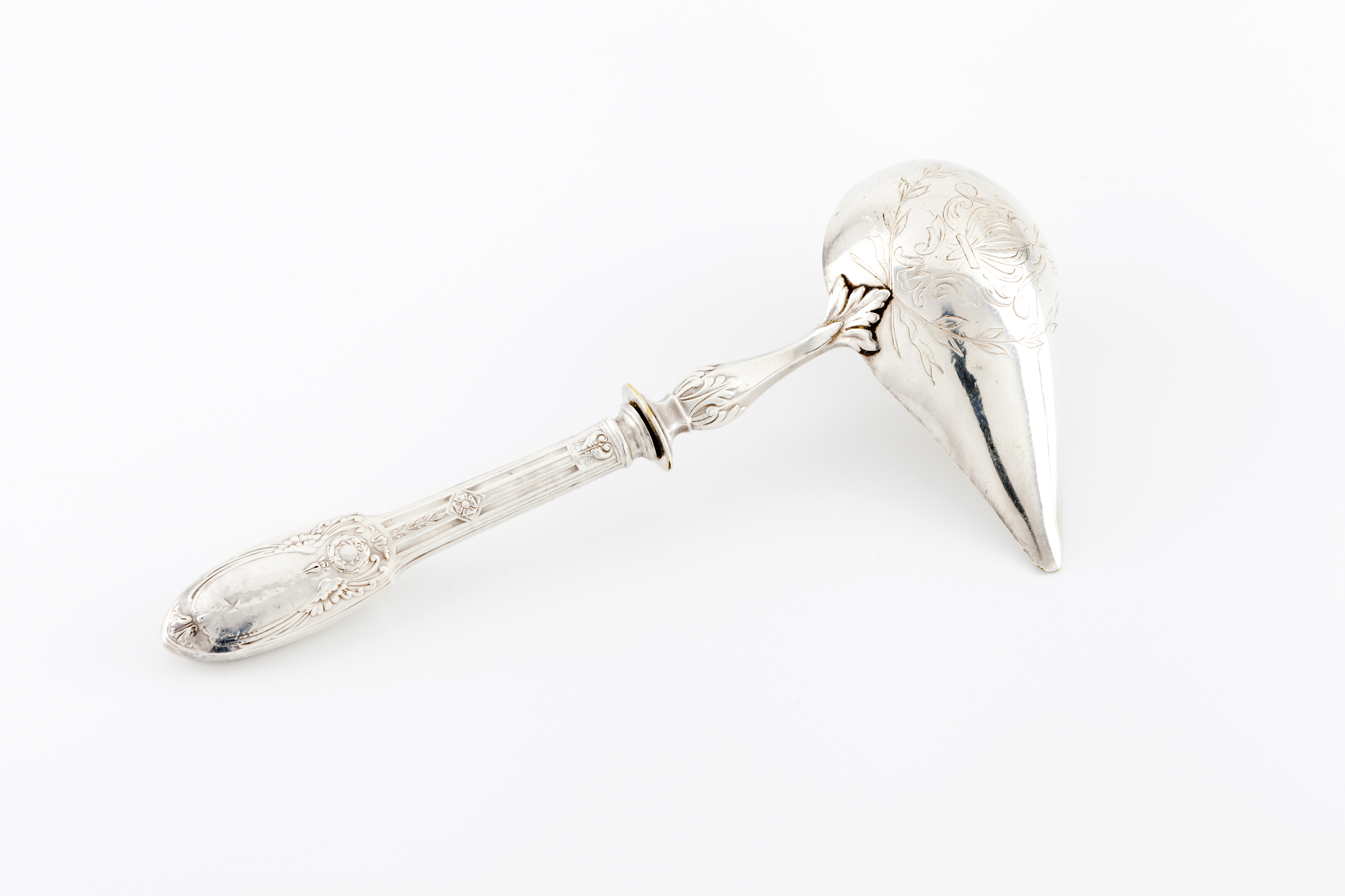 Decoração neoclássica com duas asas ladeando cartela vazia, coroa de louros, quadrifólio, palmetas e enrolamentos. A concha gravada com coroa de louros, fita e enrolamentos emoldurando flor de lis coroada