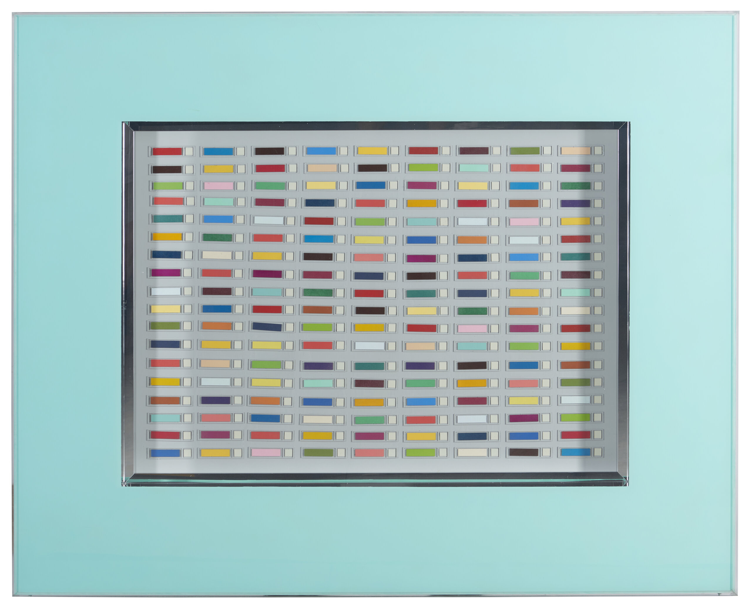 Estrutura em alumínio, acrílico e tinta de esmalte, espelho e construção em cartão prensado