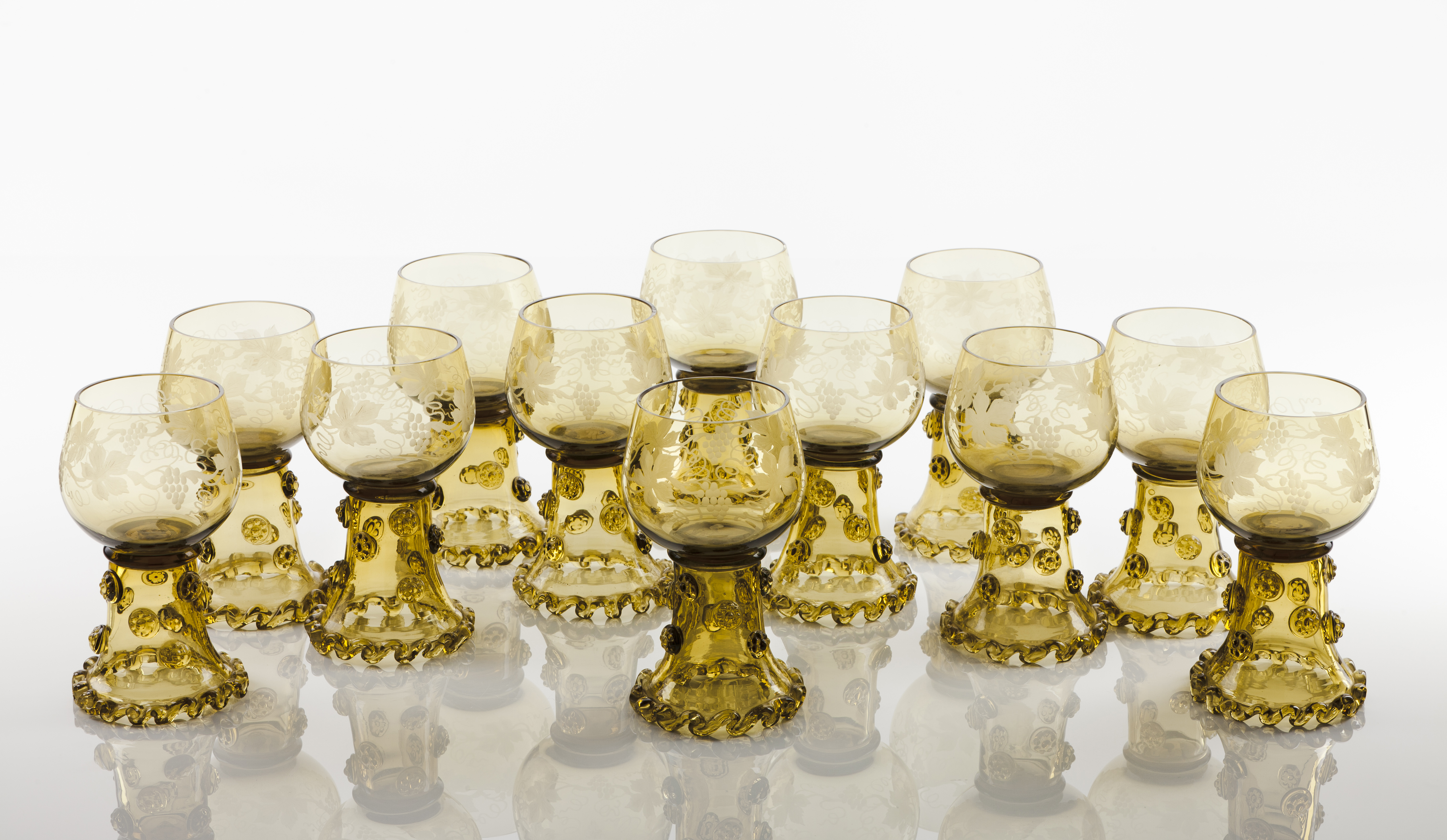 Conjunto de 12 grandes copos de caça em vidro verde