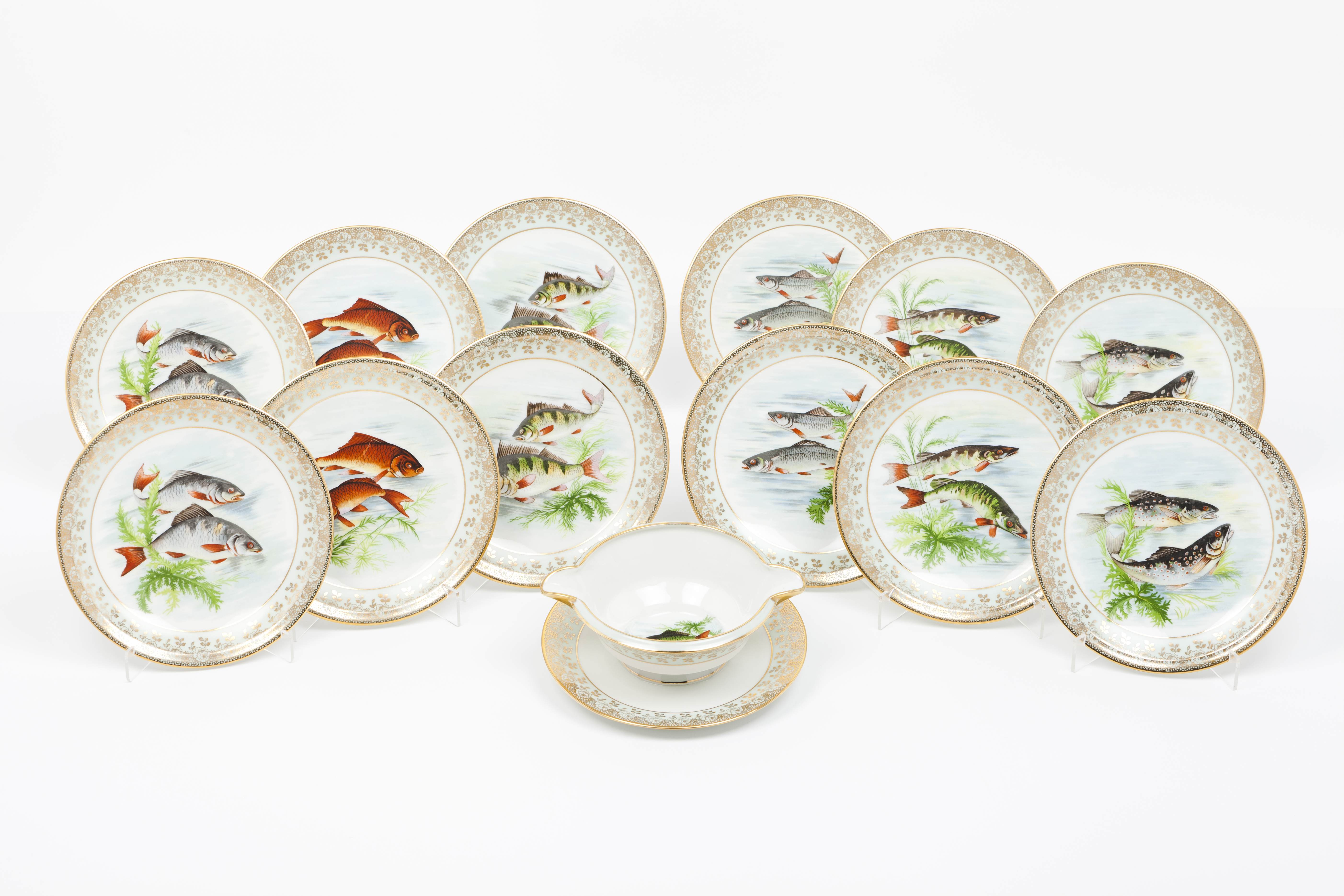 Porcelana, decoração de peixes e plantas num lago, o bordo com rosas e seixos num fundo verde realçado por filete a ouro. 6 tipos de peixes diferentes. Marcado "Limoges France Porcelaine d'Art en or"
