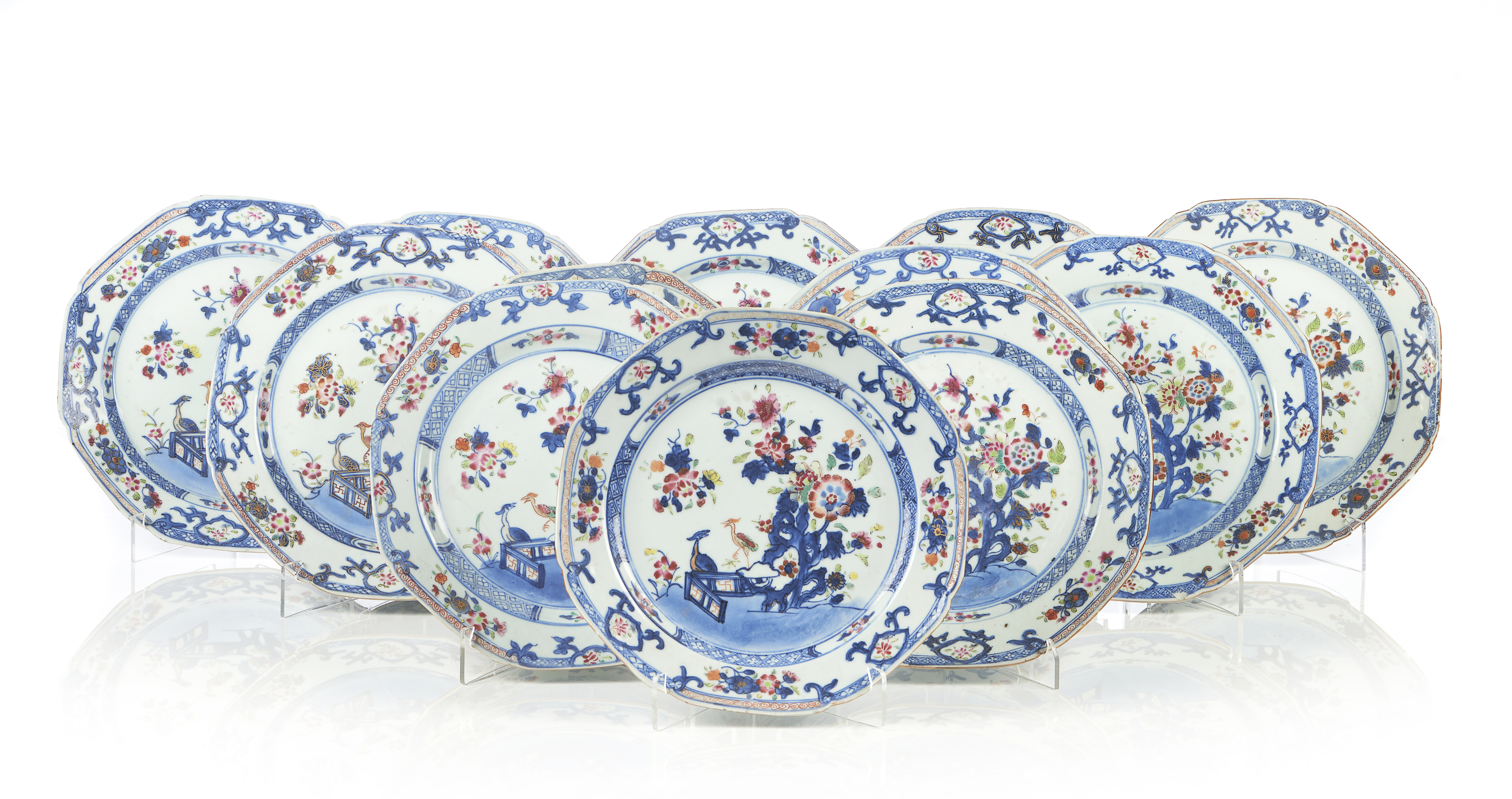 Decoração a azul, policromada e dourada representando jardim com cerca, aves e motivos florais