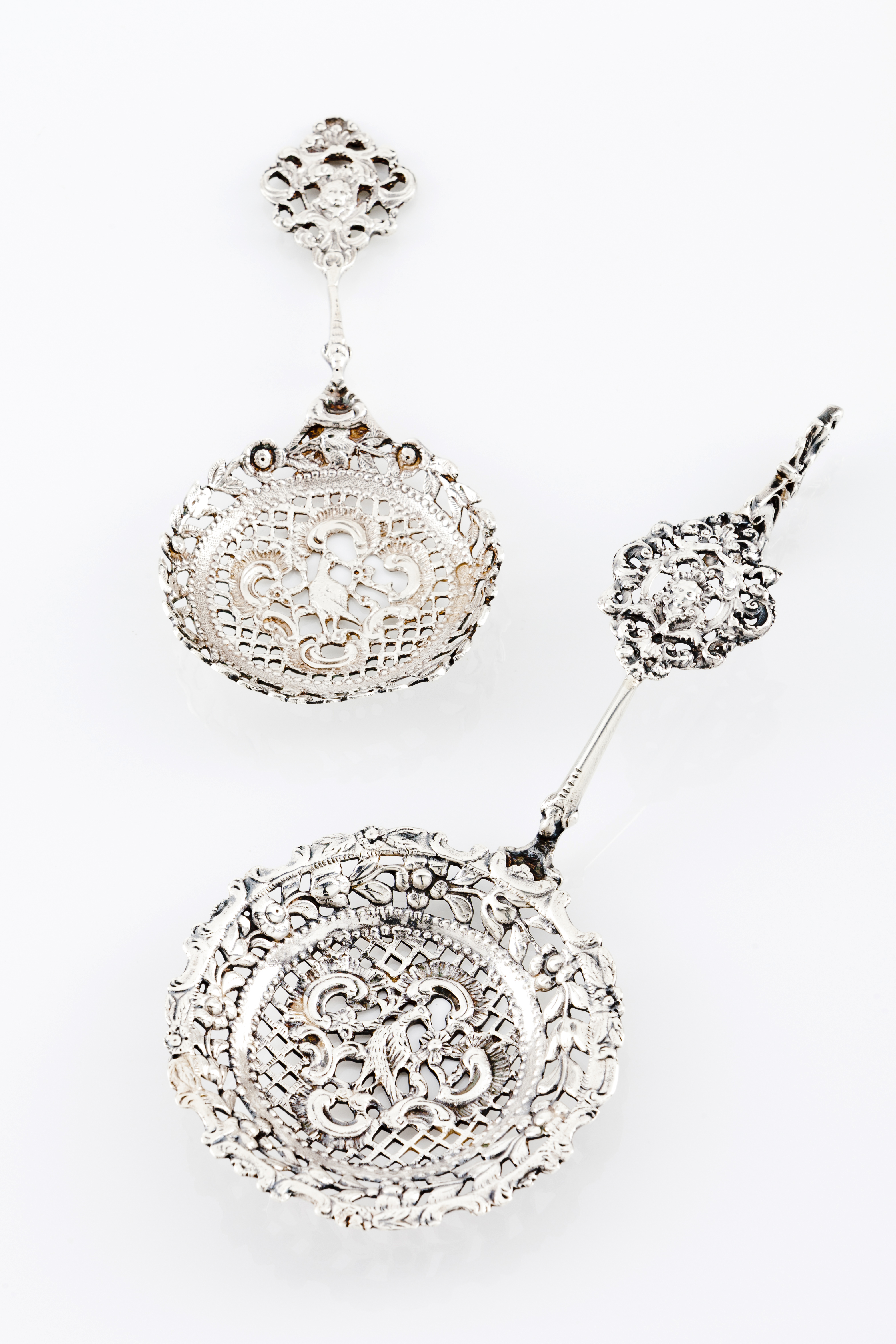 Decoração vazada com pássaros em cartela floral sobre campo de malha emoldurada por fita. Cabos com friso vazado com motivos de flores e folhagem. Cartela central com mascarão emoldurado por arabescos