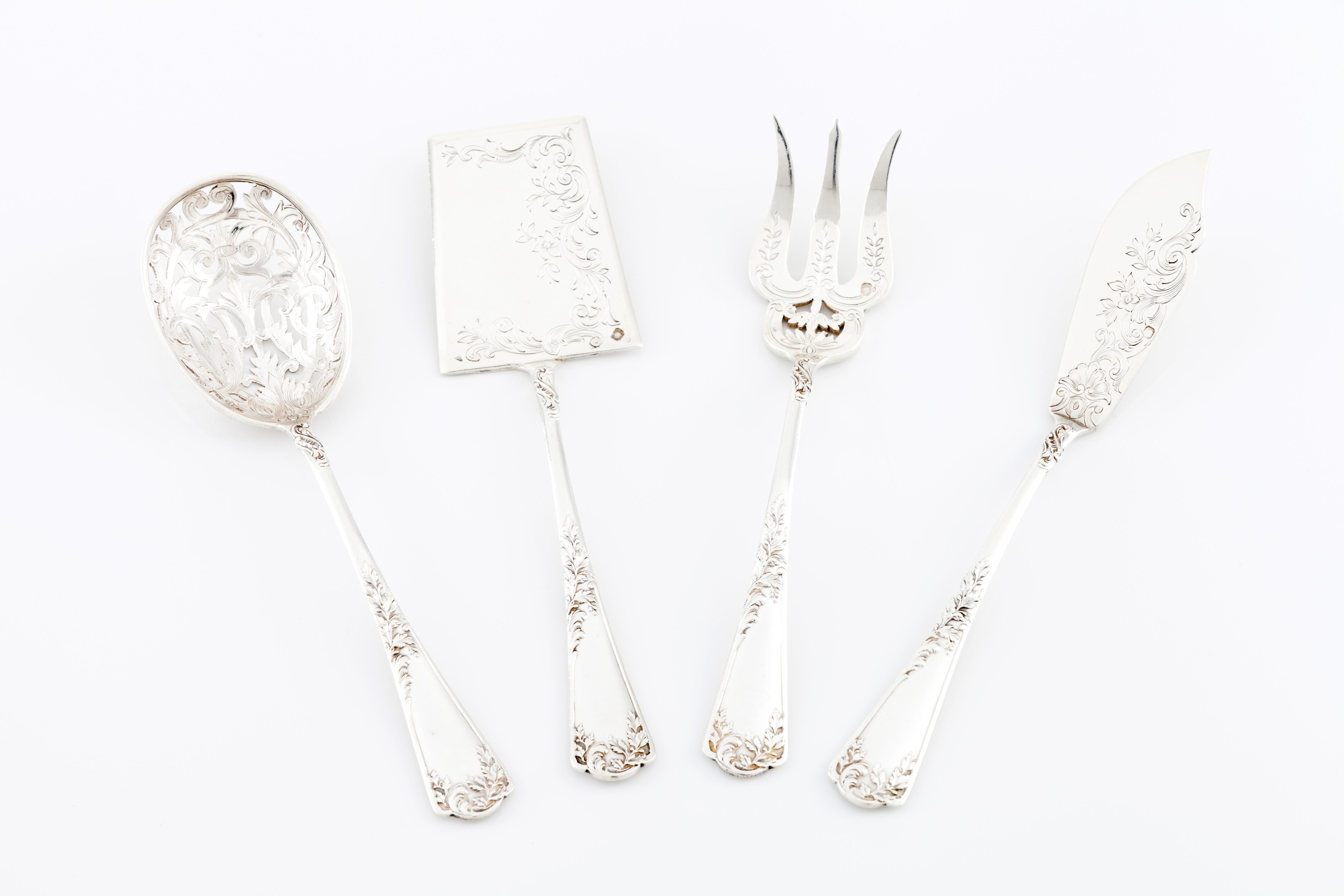 Decoração de fios e enrolamentos de folhagem, o garfo e a colher com decoração floral vazada