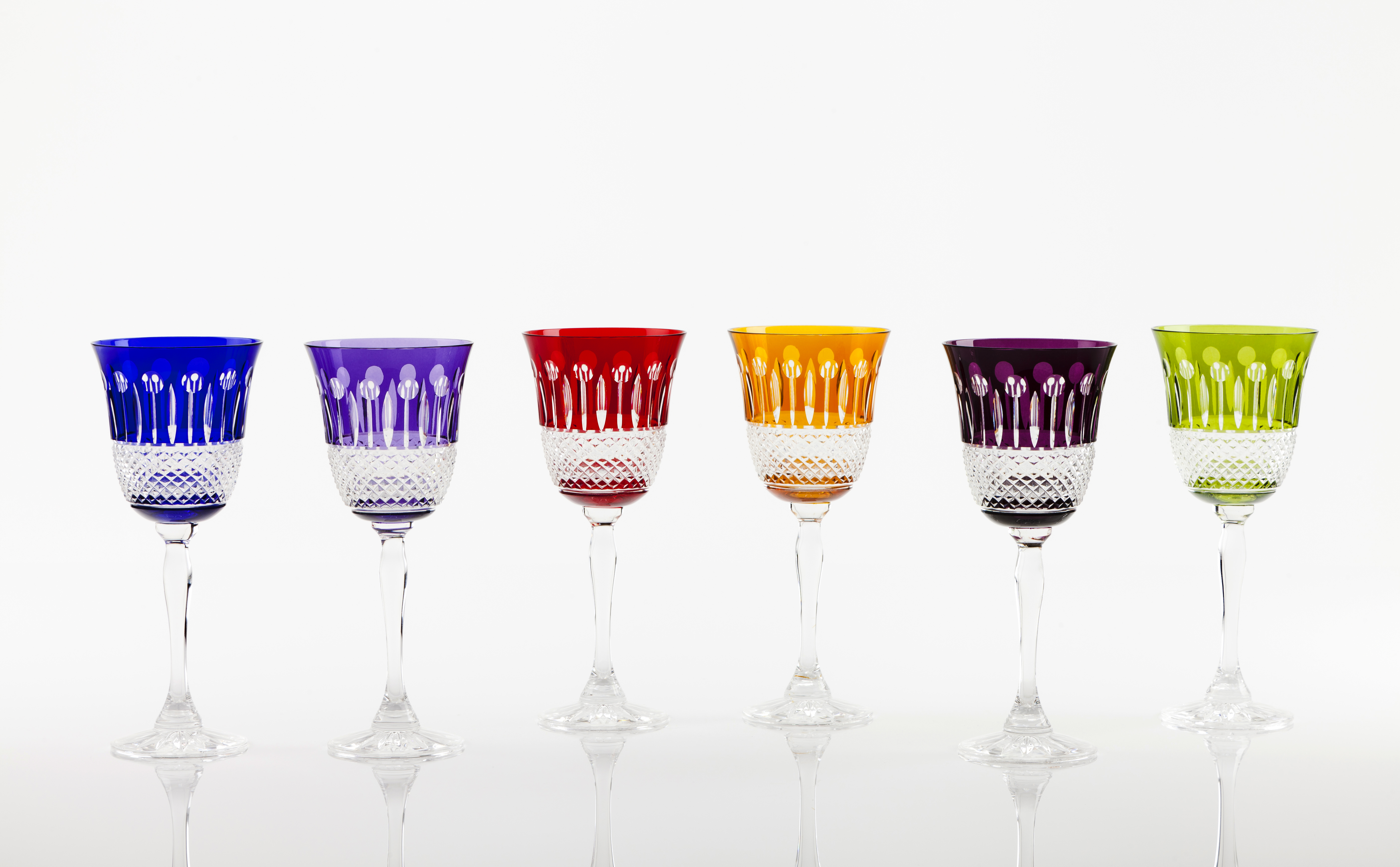 Cristal colorido inspirado no modelo Tommy da fábrica SAINT LOUIS; 1 roxo, 1 azul, 1 granada, 1 verde, 1 malva, 1 amarelo dourado