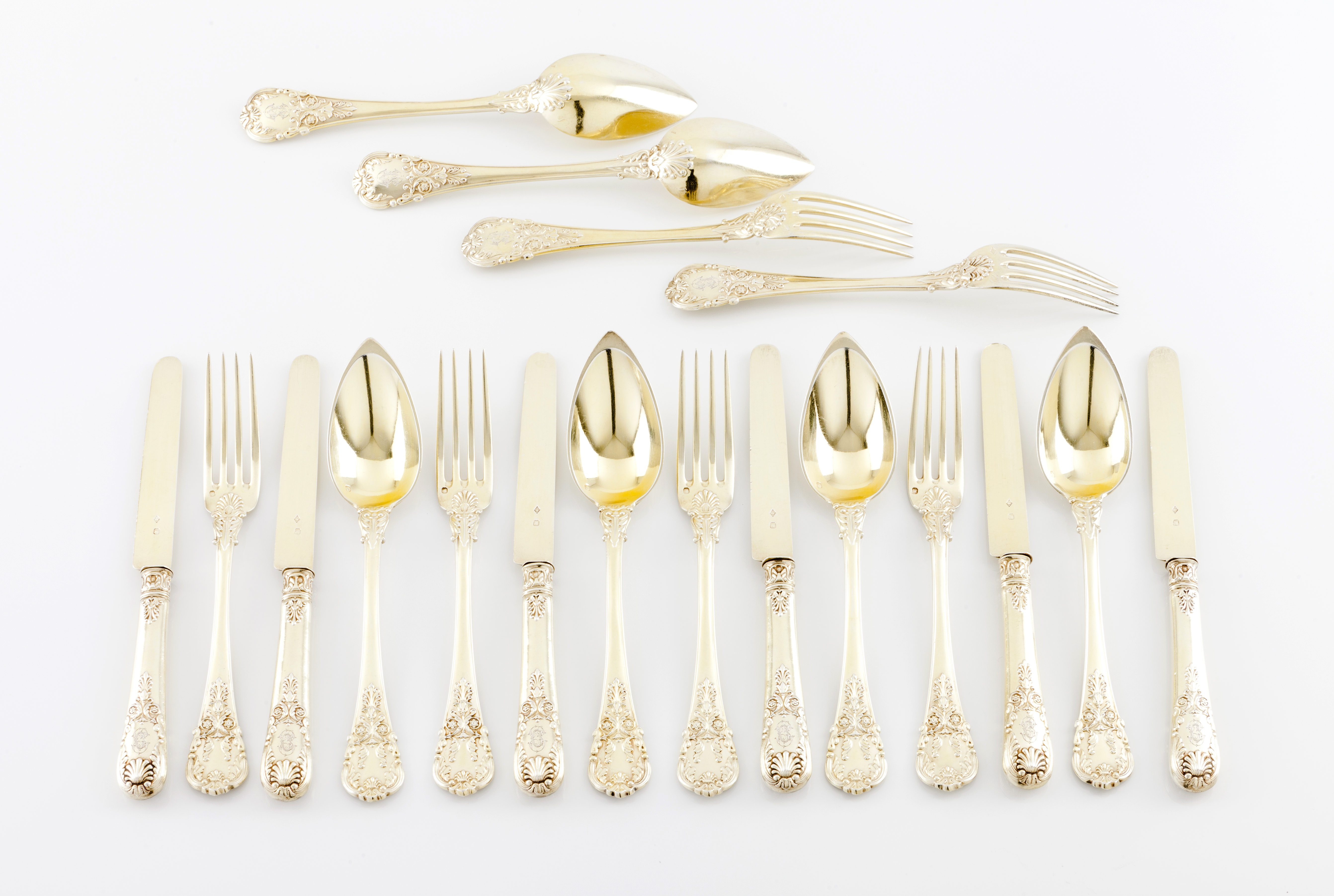 6 garfos e 6 colheres de sobremesa com marca de fabricante Charles-Salomon MAHLER e 6 facas para fruta com marca de fabricante Eugène-Théodore GILLOT.