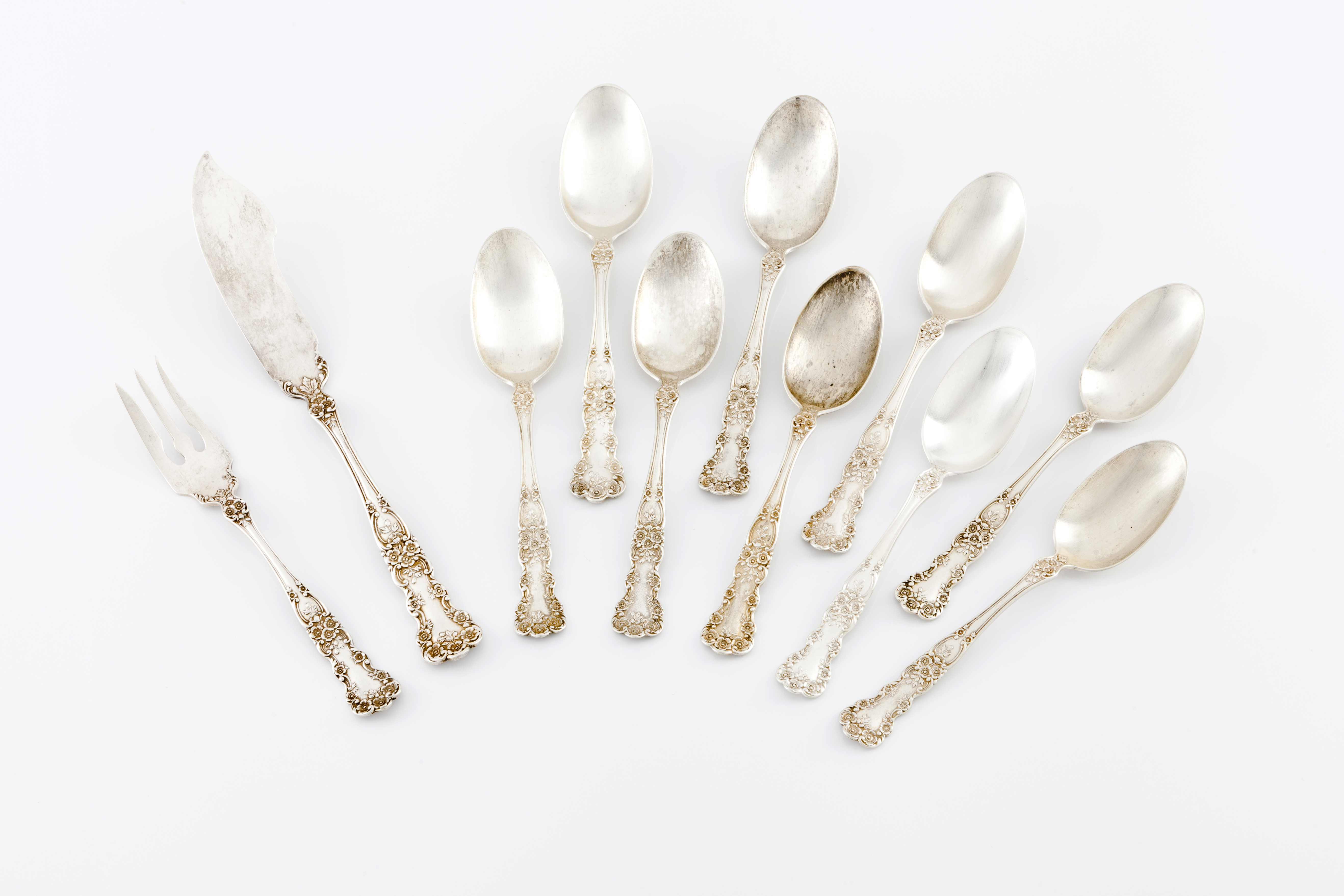 Prata Inglesa estilo Romântico com decoração de folhagem, enrolamentos, flores e filetes, marcadas STERLING, PAT.1900, Leão Passante para prata sterling 925/1000 e âncora