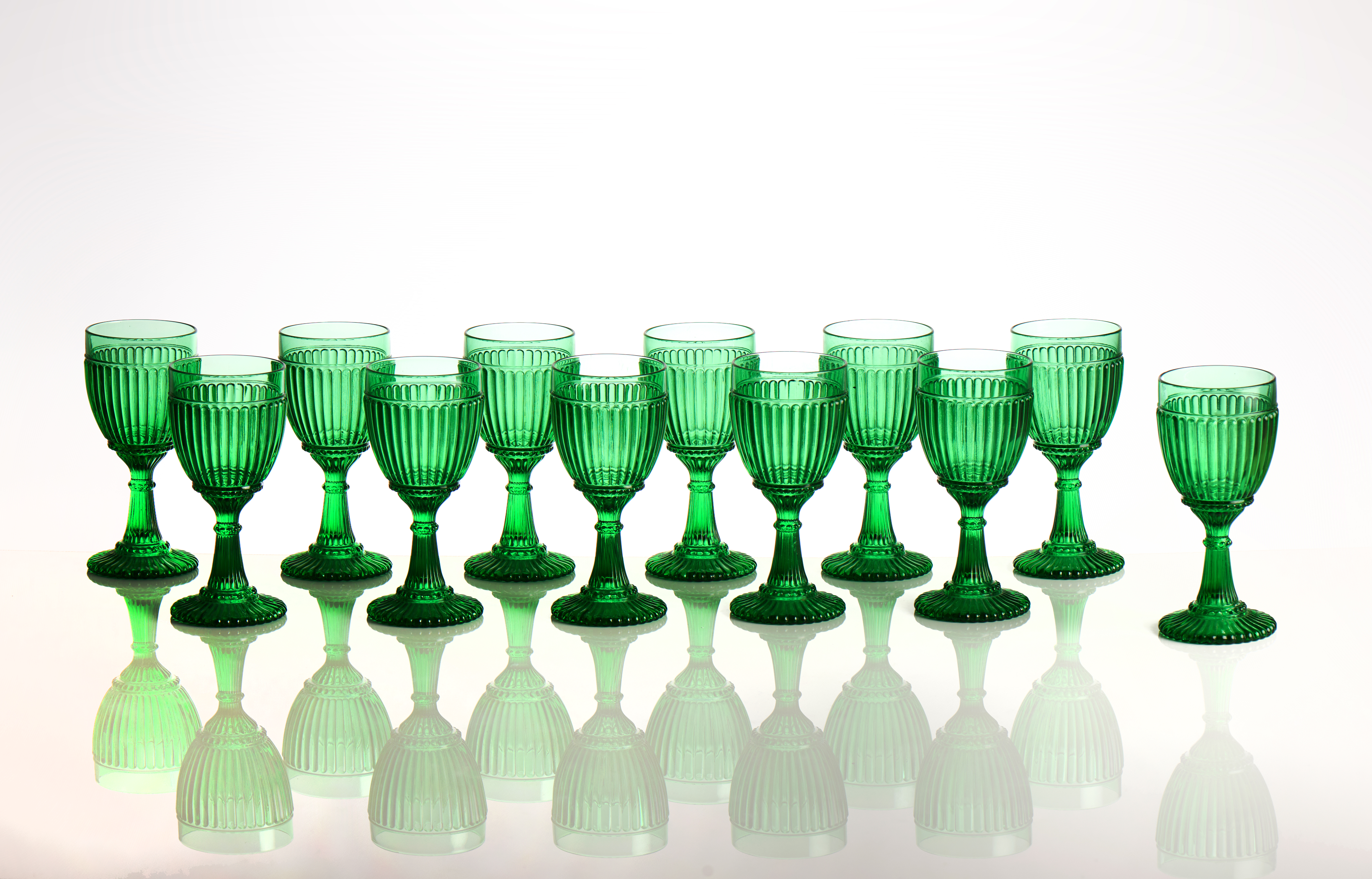 Vidro moldado de cor esmeralda com decoração de gomos e frisos perlados