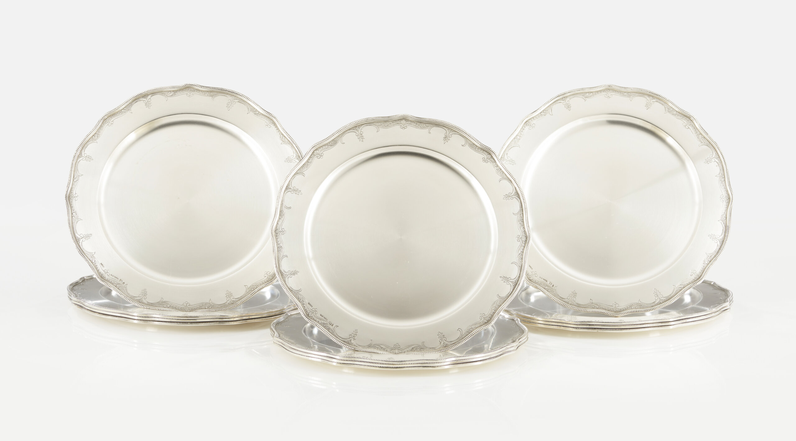 Bordo recortado, aba com friso perlado e decoração gravada de motivos vegetalistas, fundo polido