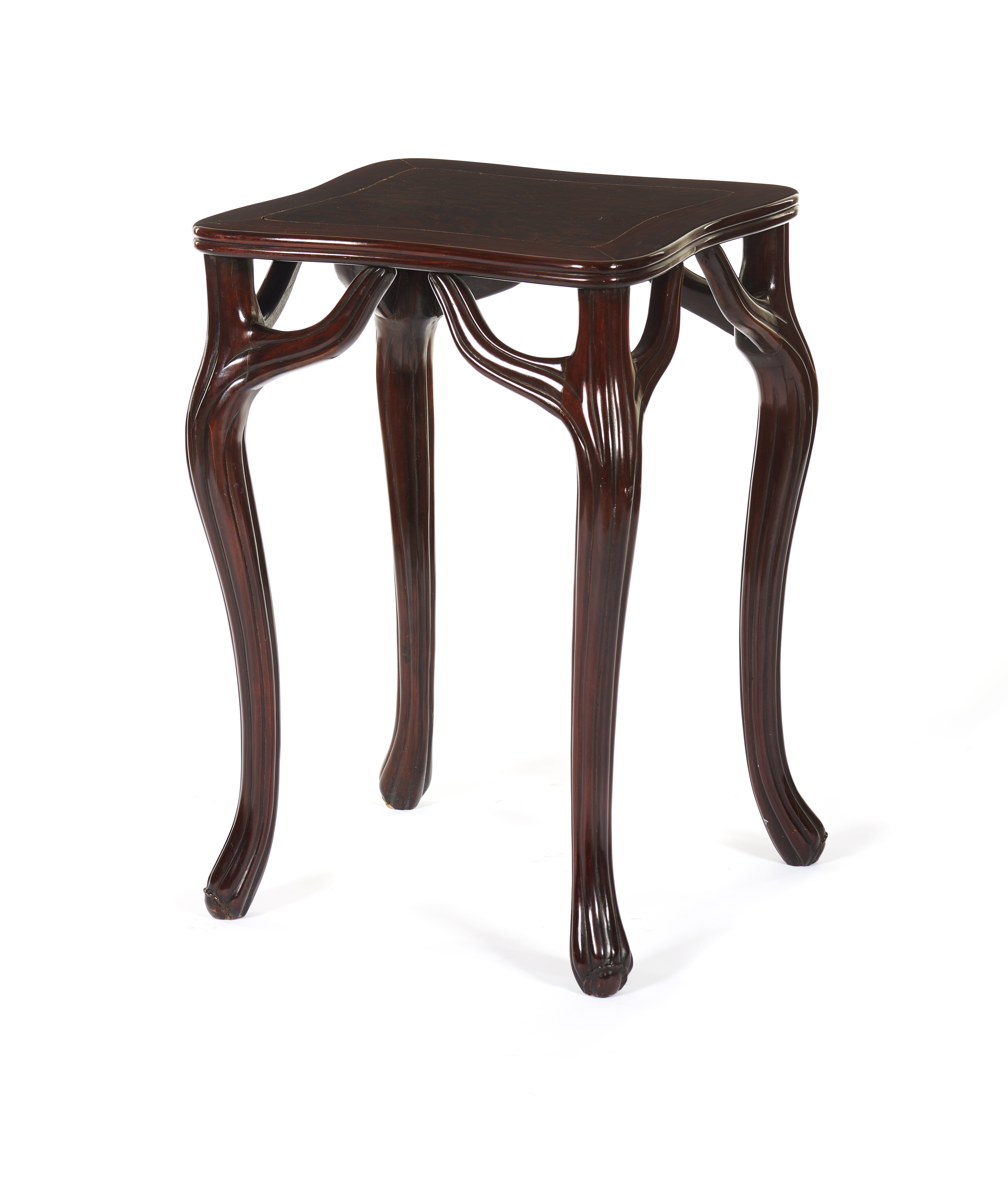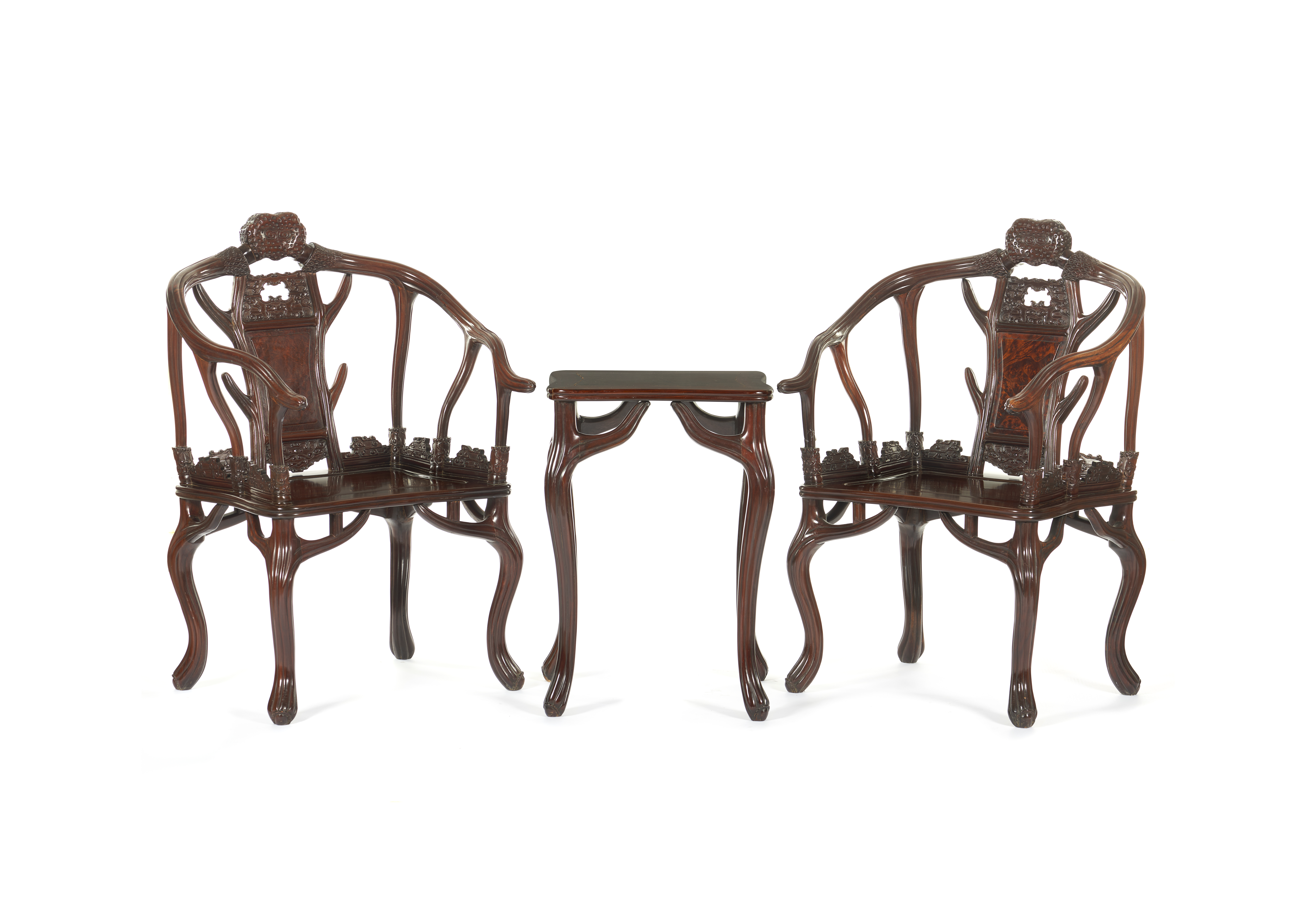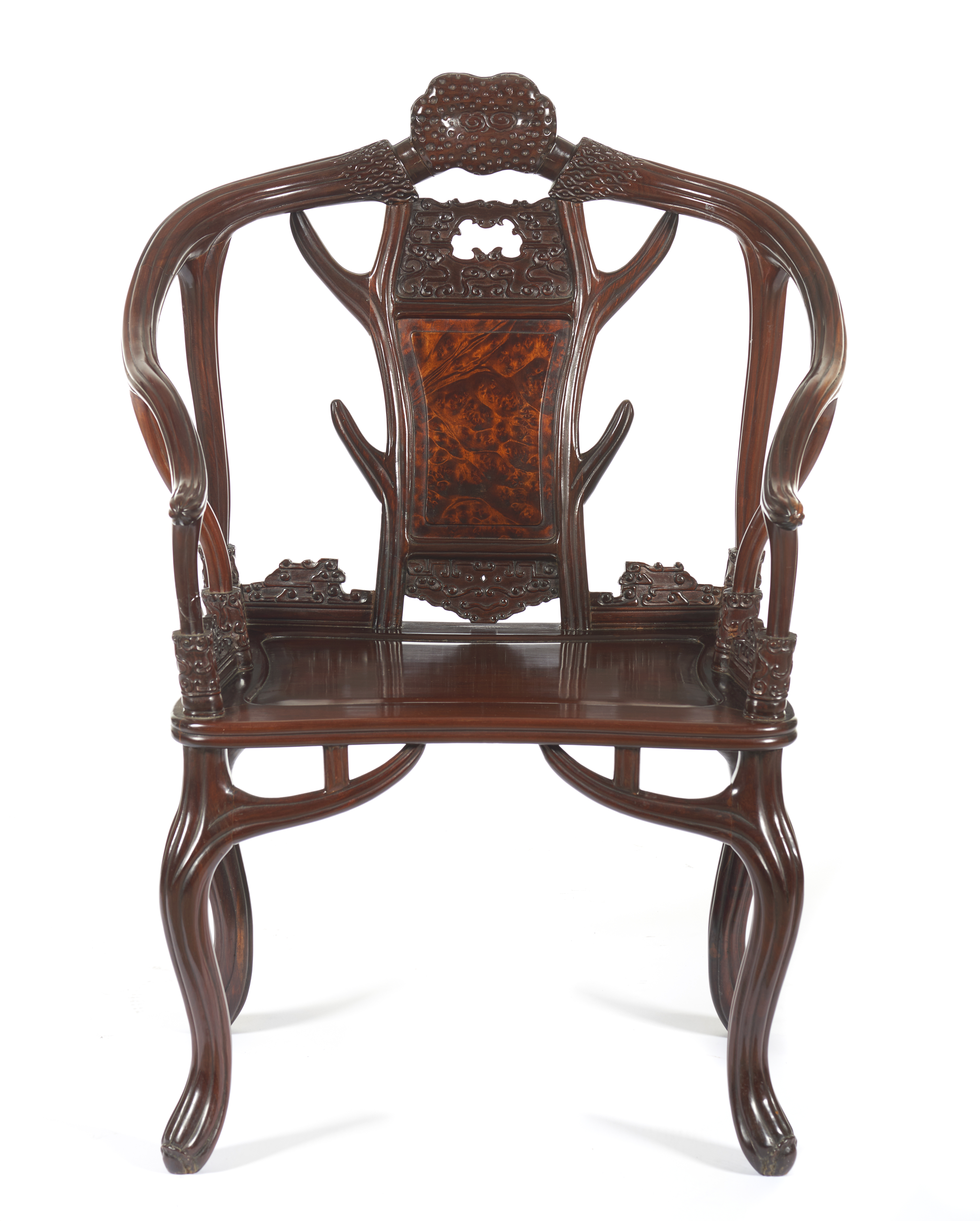 Em madeira de lei, com decoração entalhada.