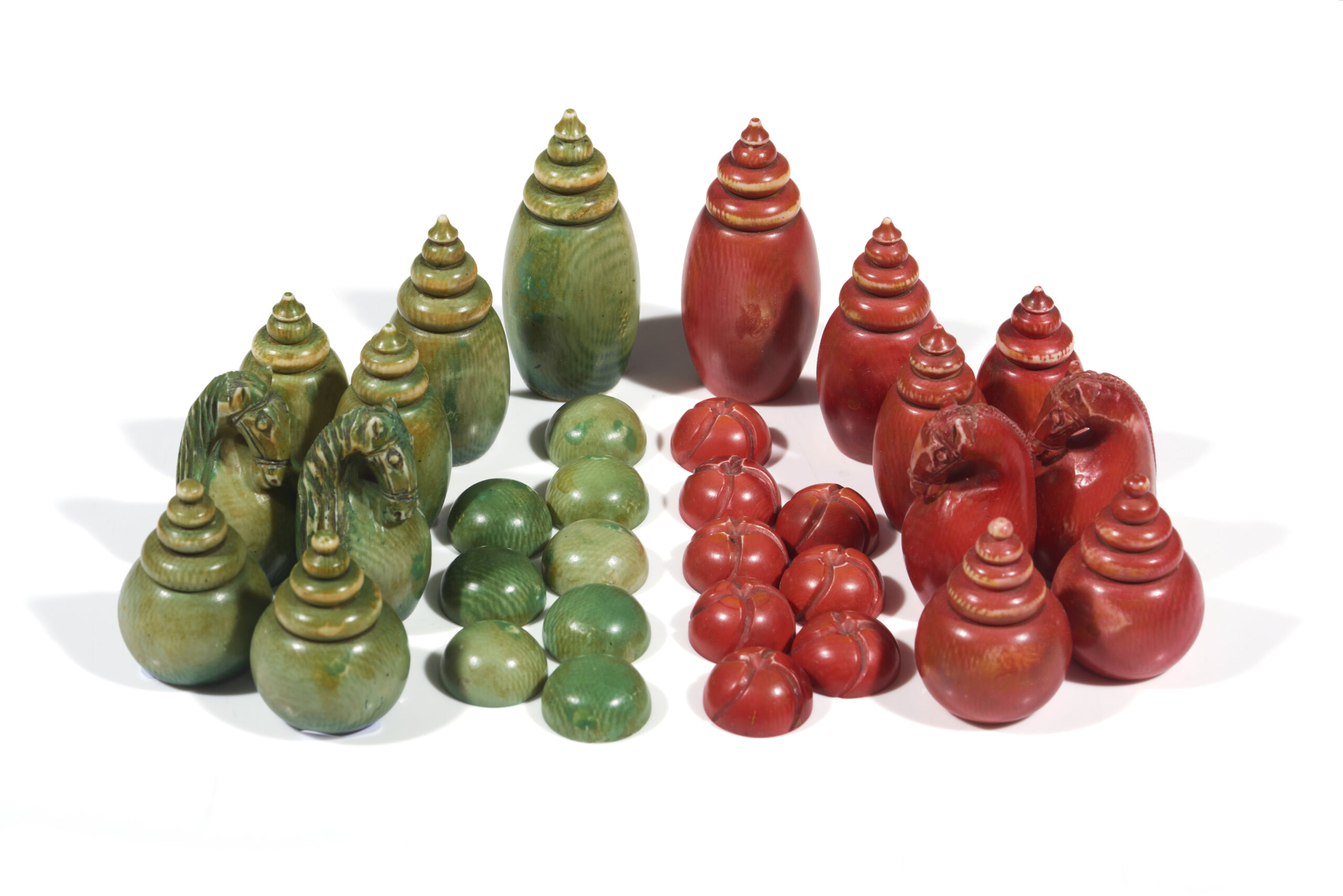 Conjunto completo com trinta e duas peças esculpidas, de forma ovóide, rematadas por coroamentos escalonados em forma de pináculos, e cavalos em forma de cabeças de cavalo estilizadas