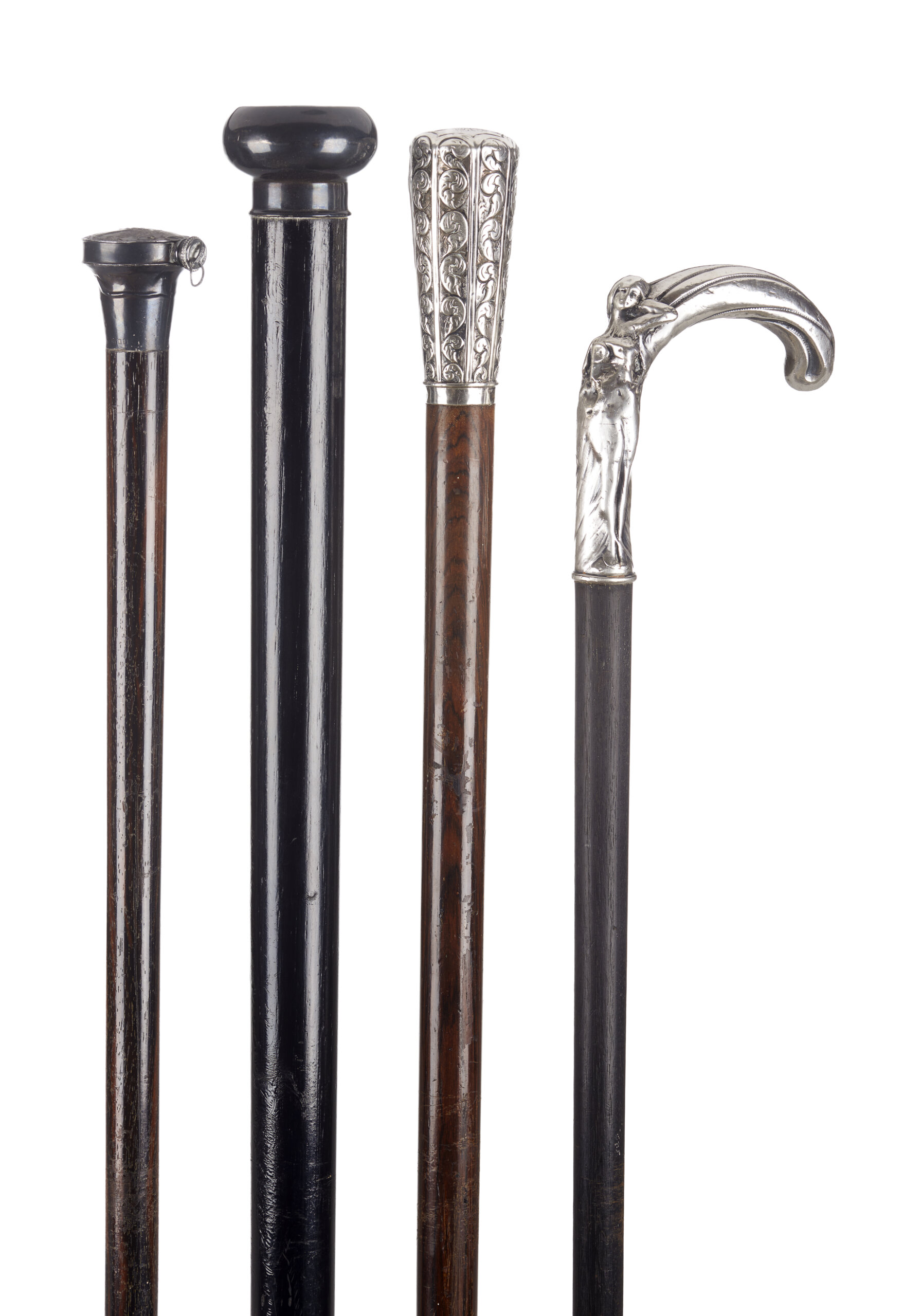 Composto por uma bengala com haste em madeira lacada a negro e castão em metal prateado de forma circular, com monograma gravado; Uma com haste em pau-santo e castão em metal prateado com decoração relevada de motivos vegetalistas; Outra com haste em pau-santo e castão metálico em forma de pequeno frasco com tampa de rosca, decorado no topo com paisagem e figura de putto; E uma com haste em madeira escurecida e castão curvo em metal prateado com figura feminina em relevo de inspiração Arte Nova