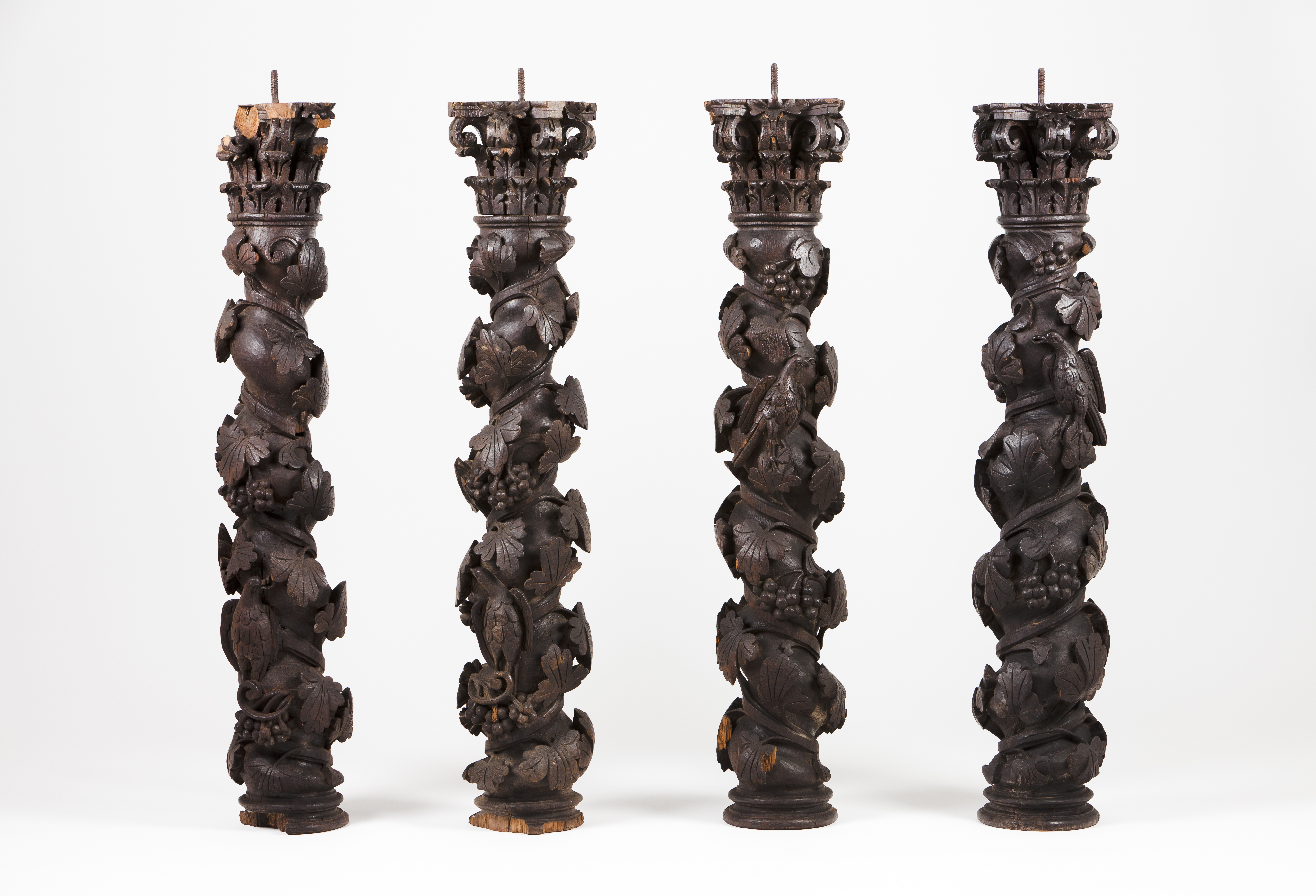 Em madeira de castanho entalhadas, decoradas com uvas e parras