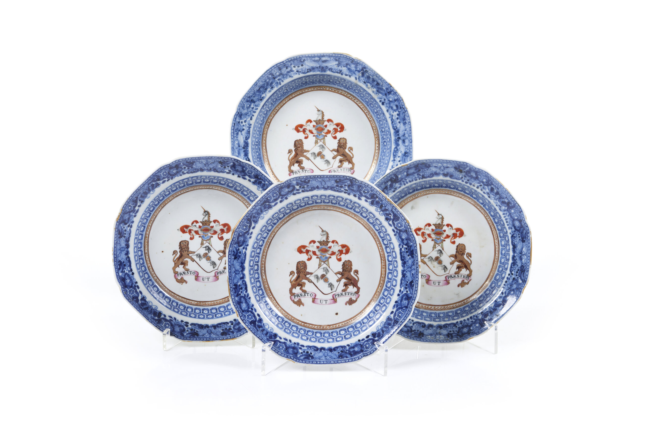 Decorados com esmaltes da Família Rosa, azul sob vidrado e dourado, representando ao centro as armas da família Preston de Valleyfield House, Escócia, com o lema "Praesto Ut Praestem"