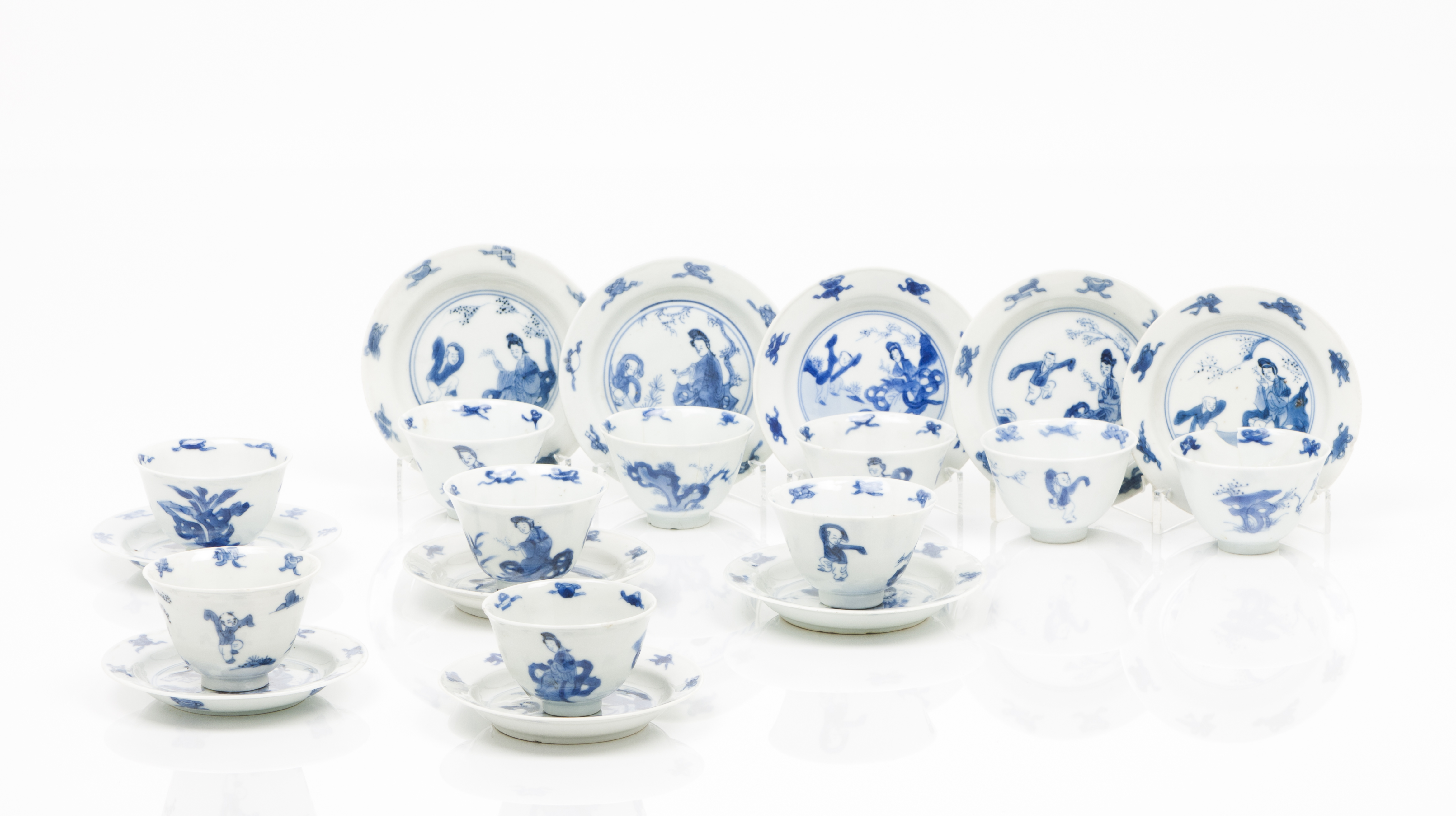 Abas dos pires e interior das taças decorados com objectos preciosos