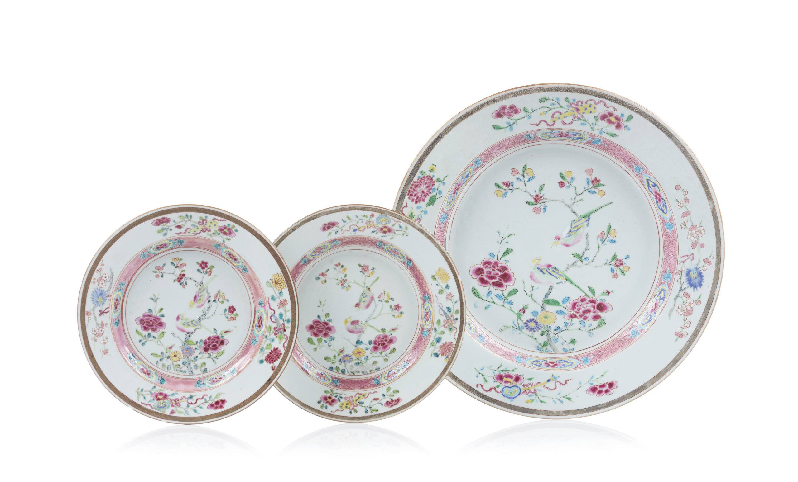Decorados com esmaltes da Família Rosa, representando ao centro composições com flores e codornizes