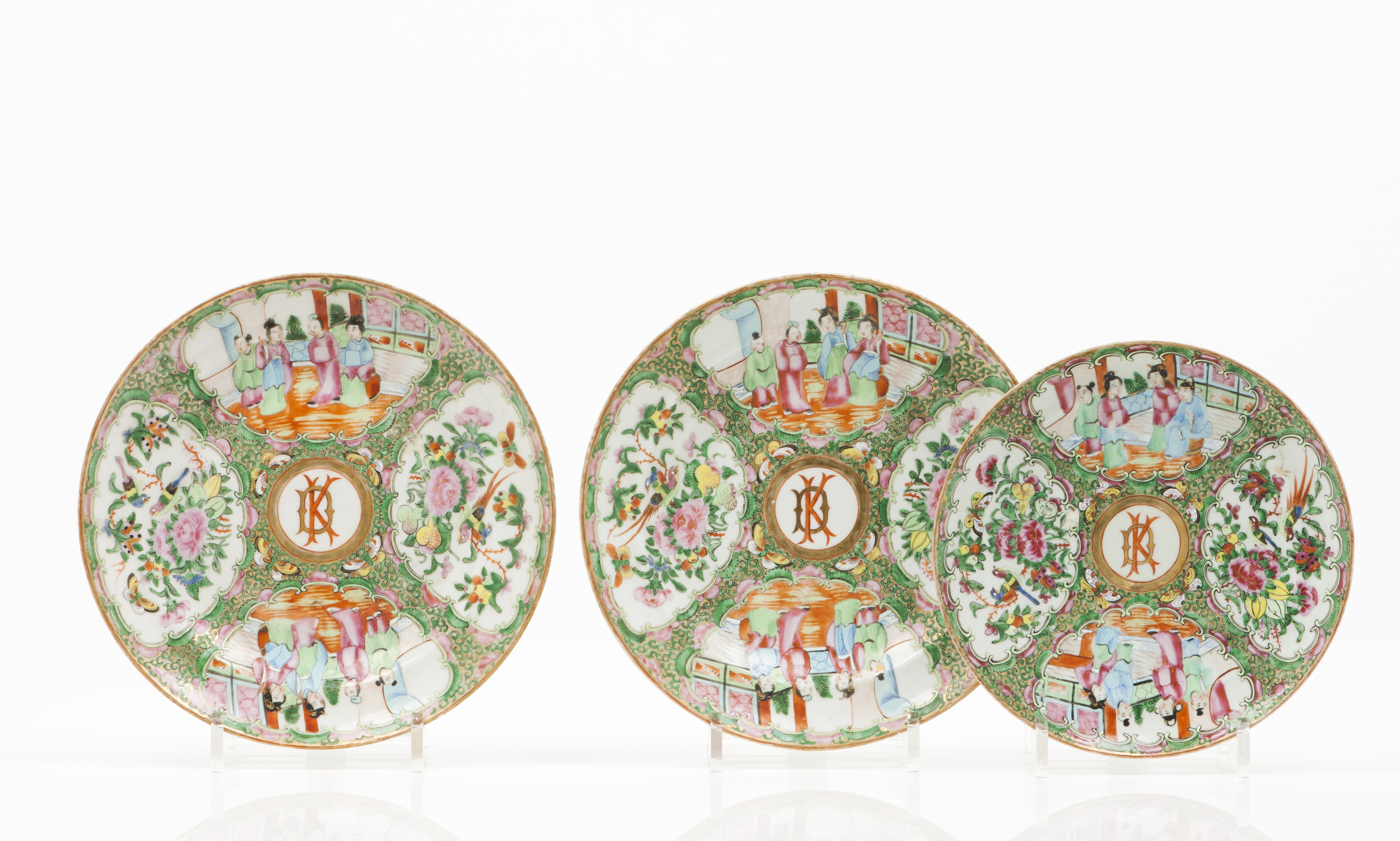 Decoração Mandarim com esmaltes da Família Rosa representando morcegos, motivos florais e reservas com cenas do quotidiano