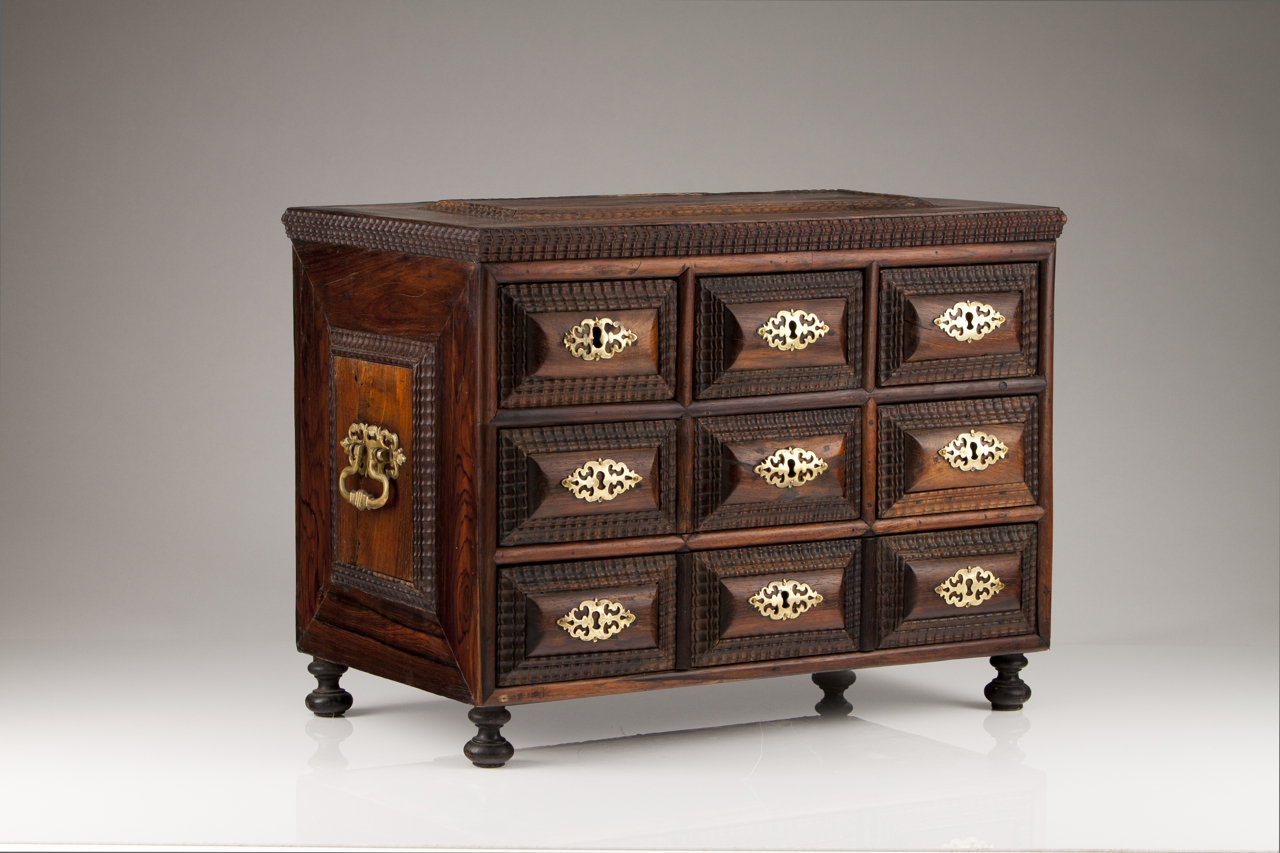 Decorado com frisos de tremidos e ferragens em metal amarelo rendilhado