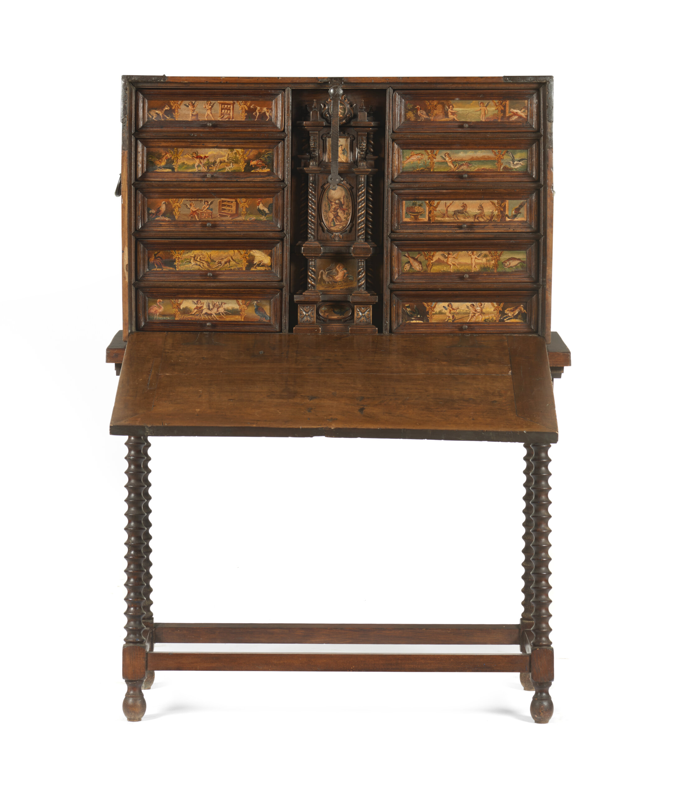 Frente das gavetas pintadas representando paisagens com animais e cenas mitológicas