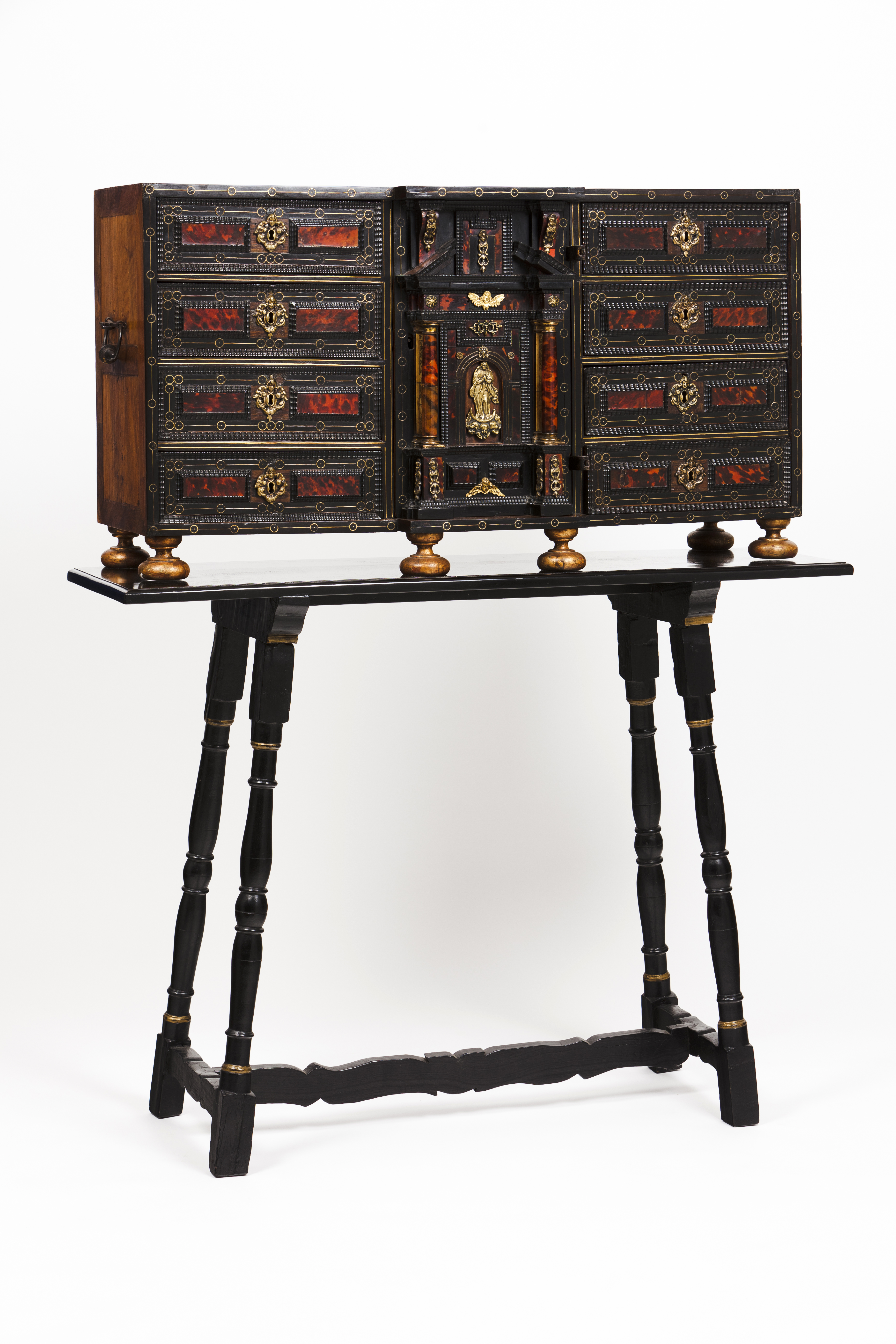 Embutidos em latão, gavetas com frentes ressaltadas com aplicações de placas de tartaruga e frisos de tremidos, nicho central com aplicações em bronze representando Nossa Senhora da Conceição e anjos