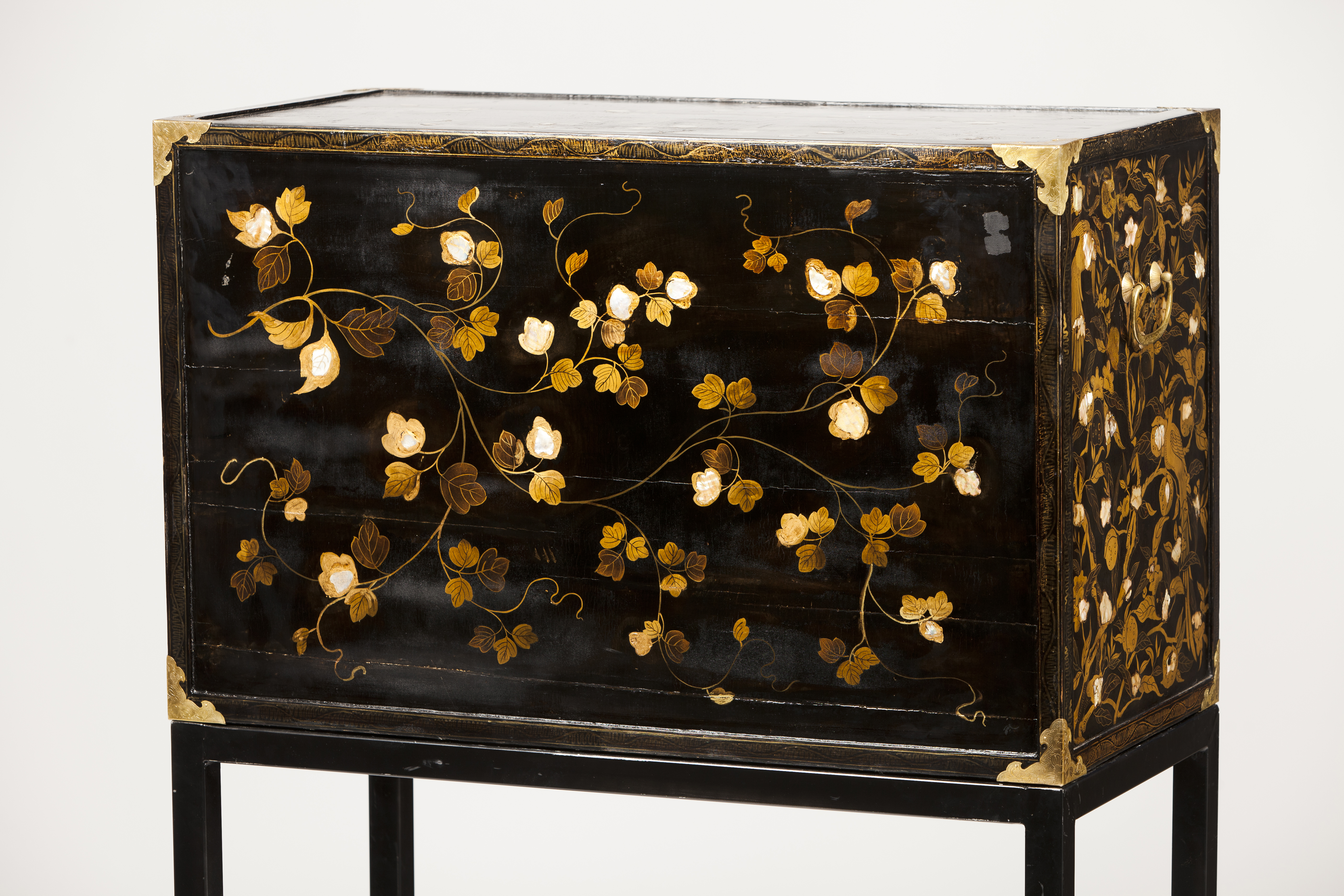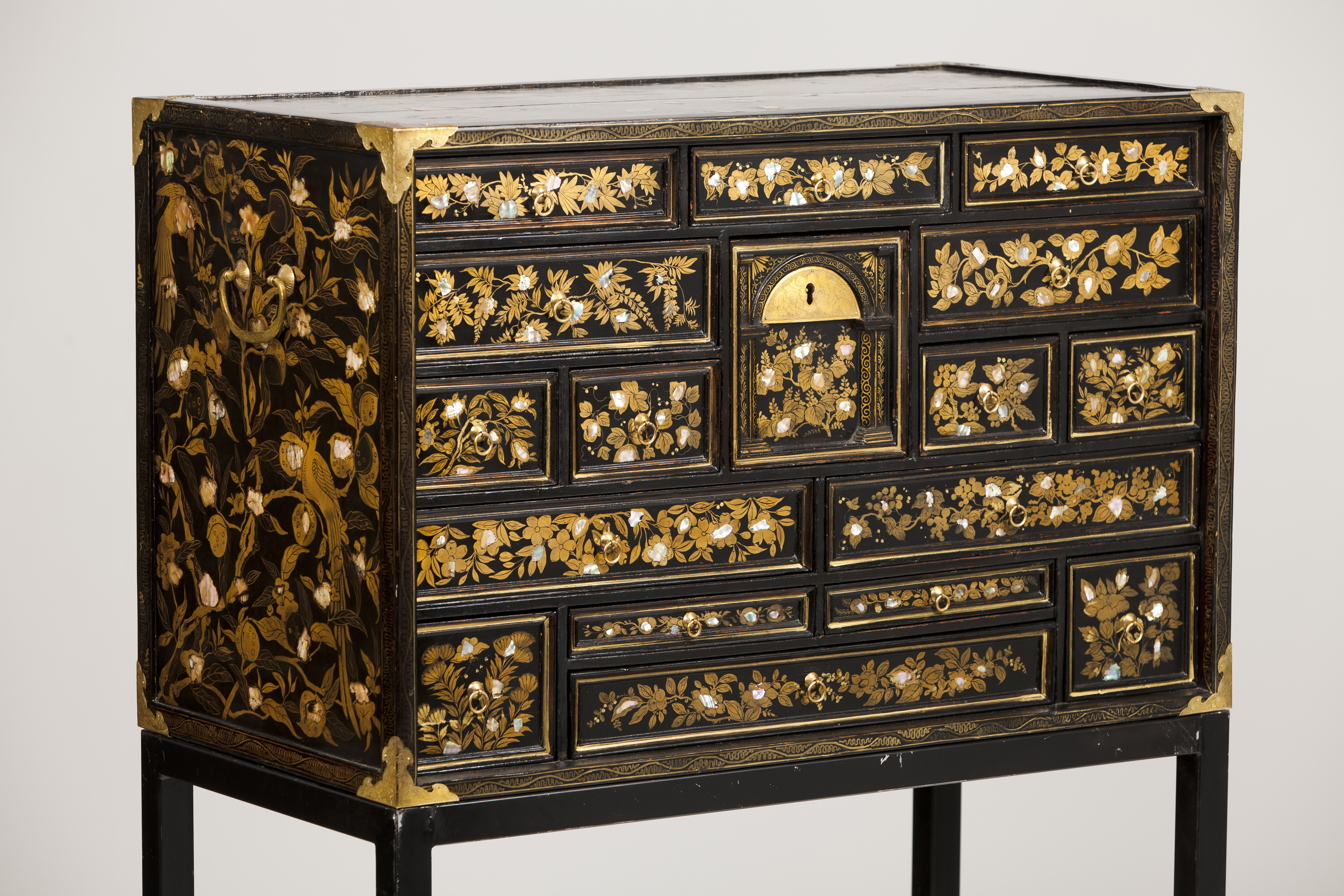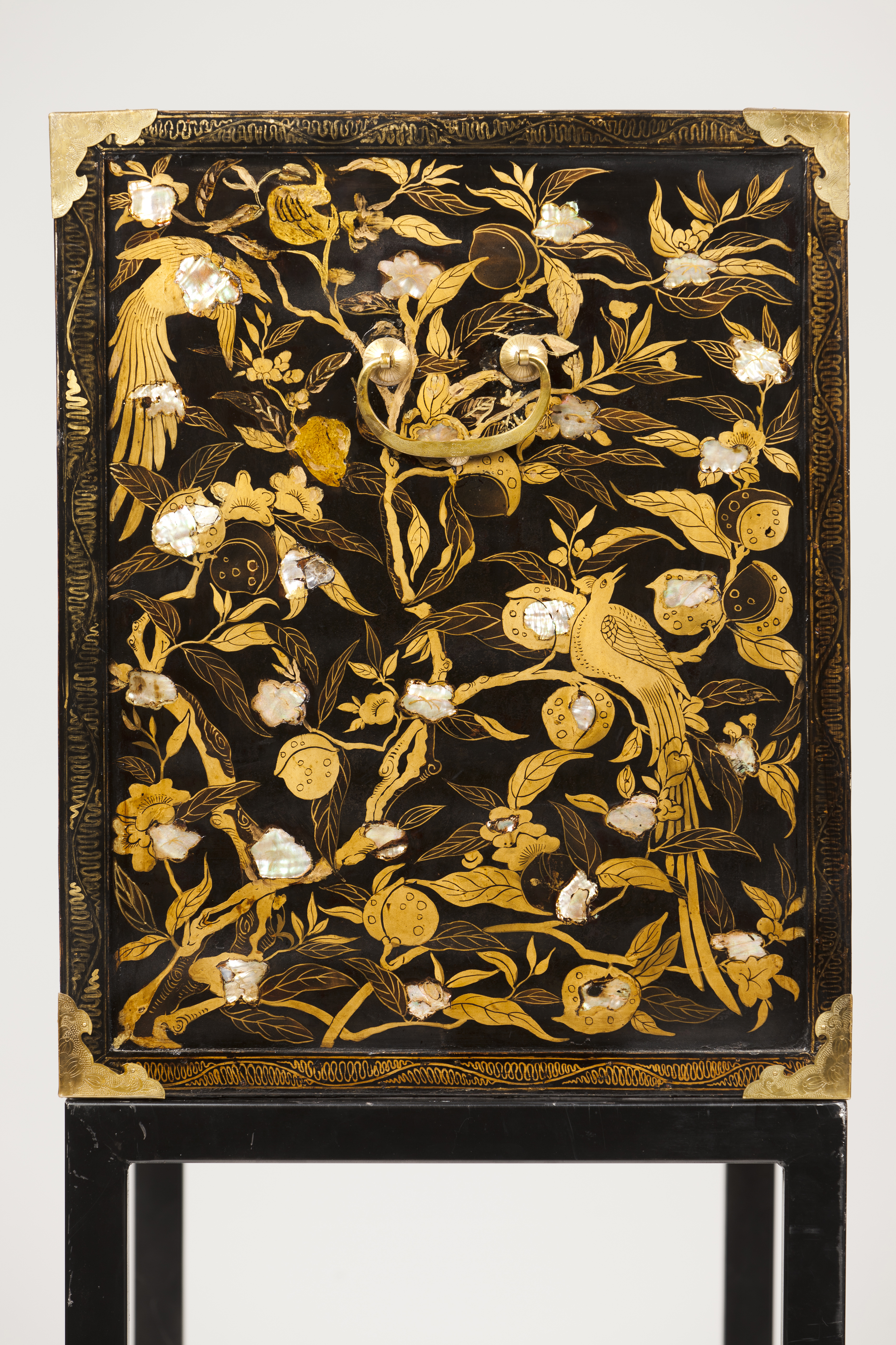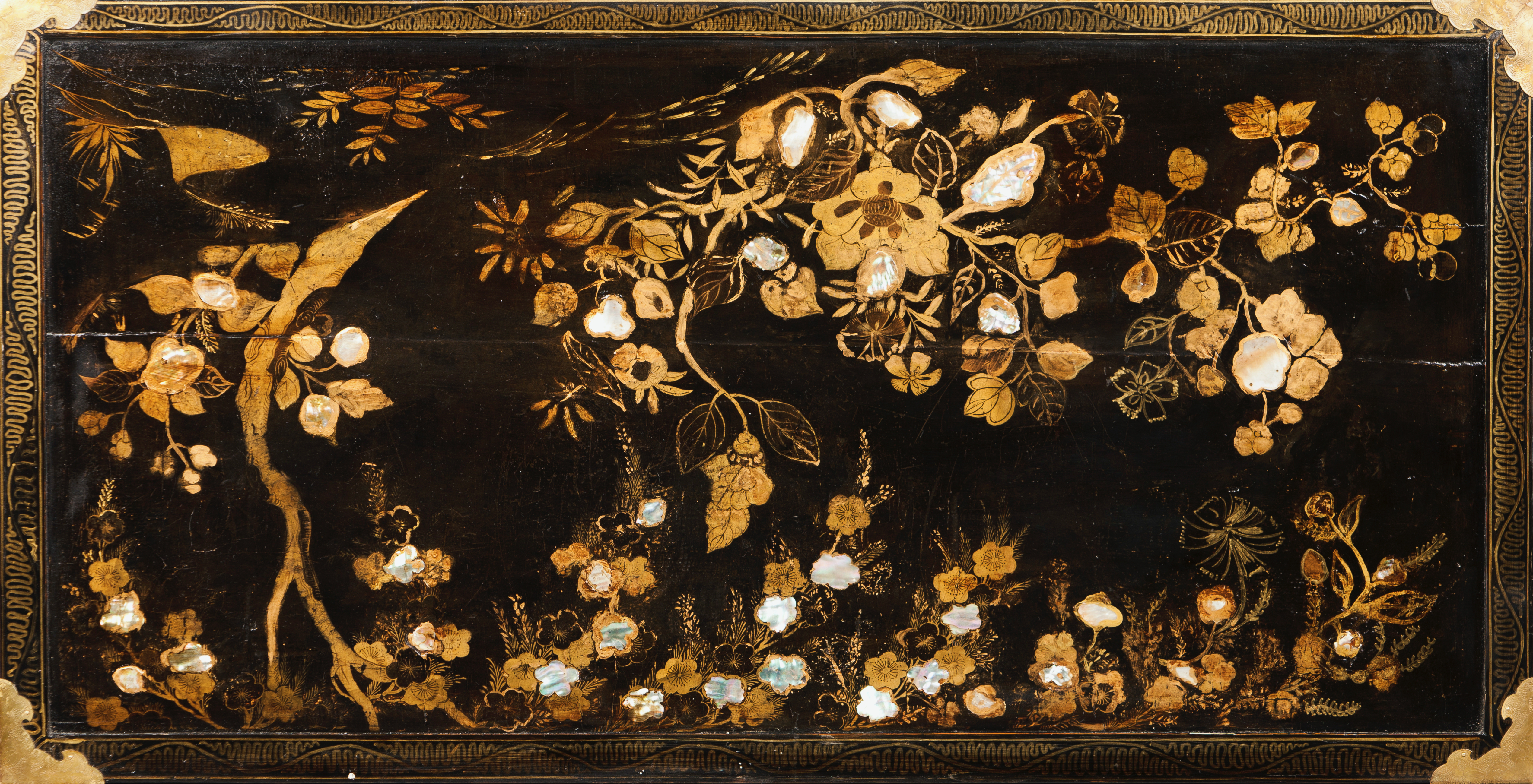 Decoração dourada e com aplicações de madrepérolas representando elementos vegetalistas e pássaros