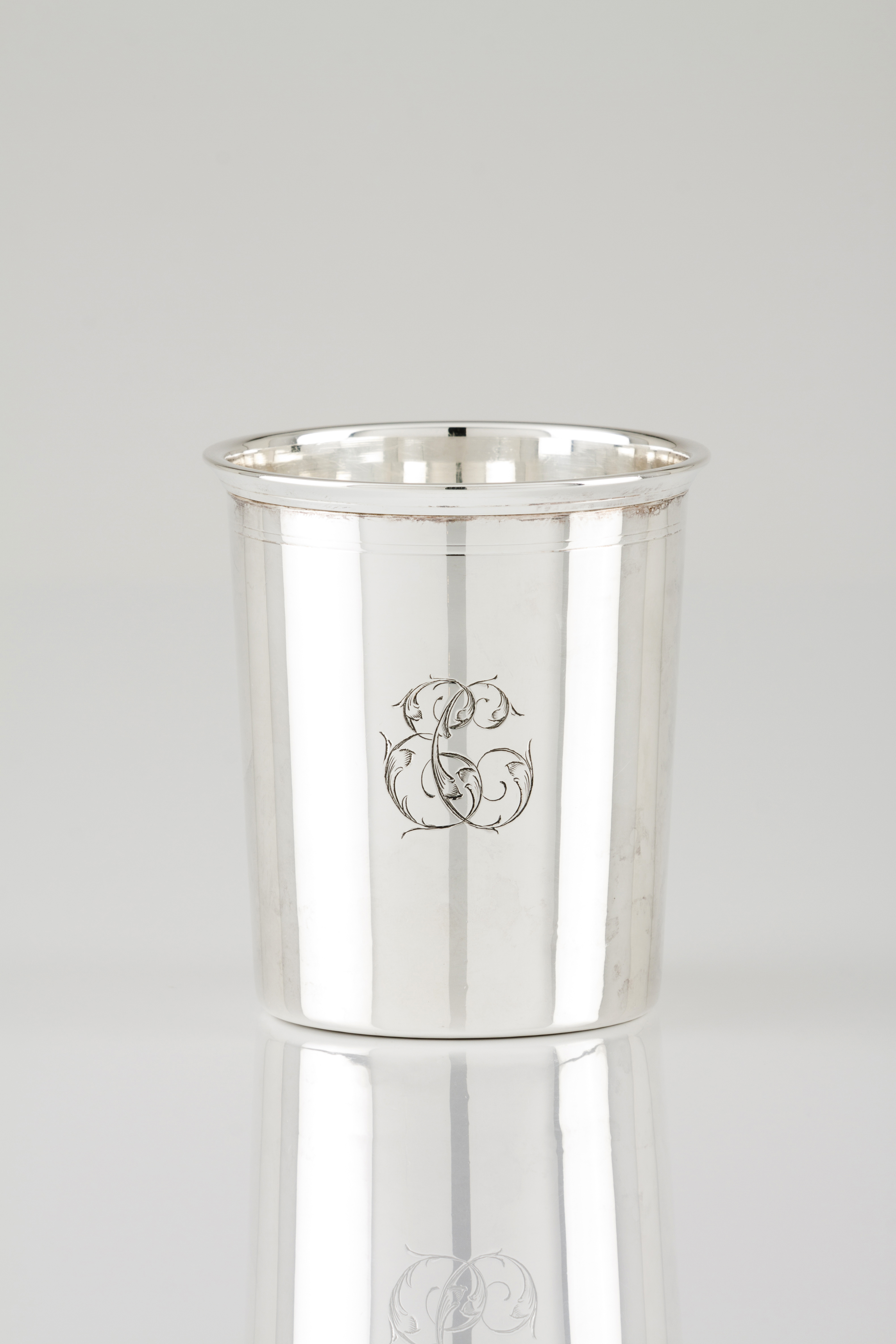 De formato cilíndrico assente em base plana com monograma gravado