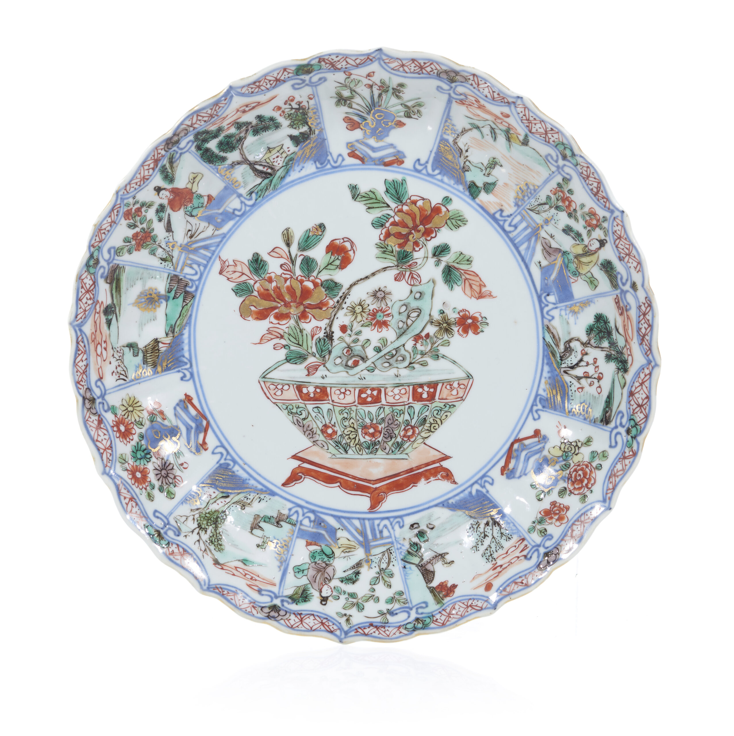 Decoração policromada com esmaltes da Família Verde representando ao centro vaso com flores e aba com reservas representando paisagens fluviais, paisagens com figuras e flores