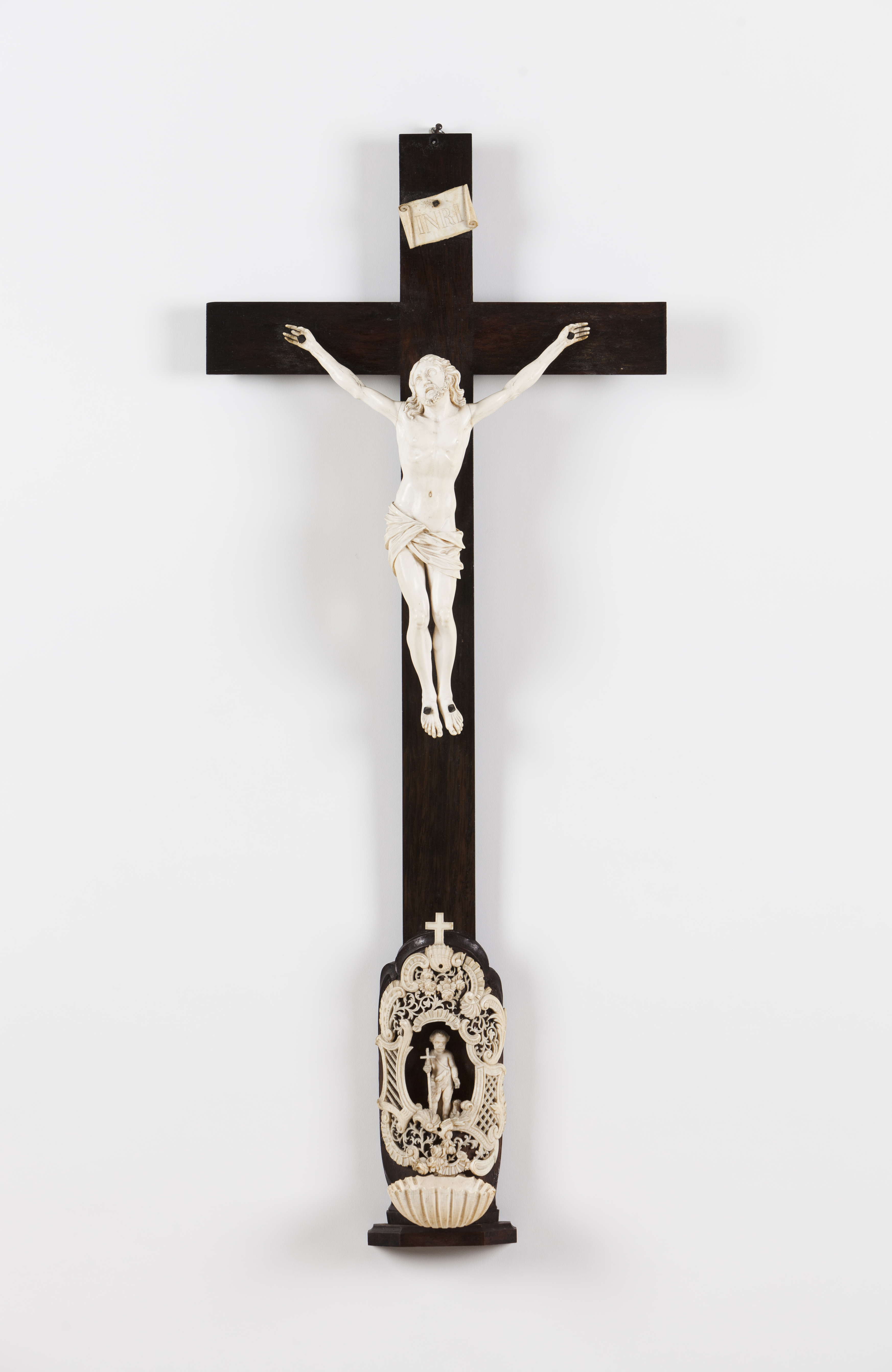 Cruz em pau-santo com pia de água-benta em marfim
