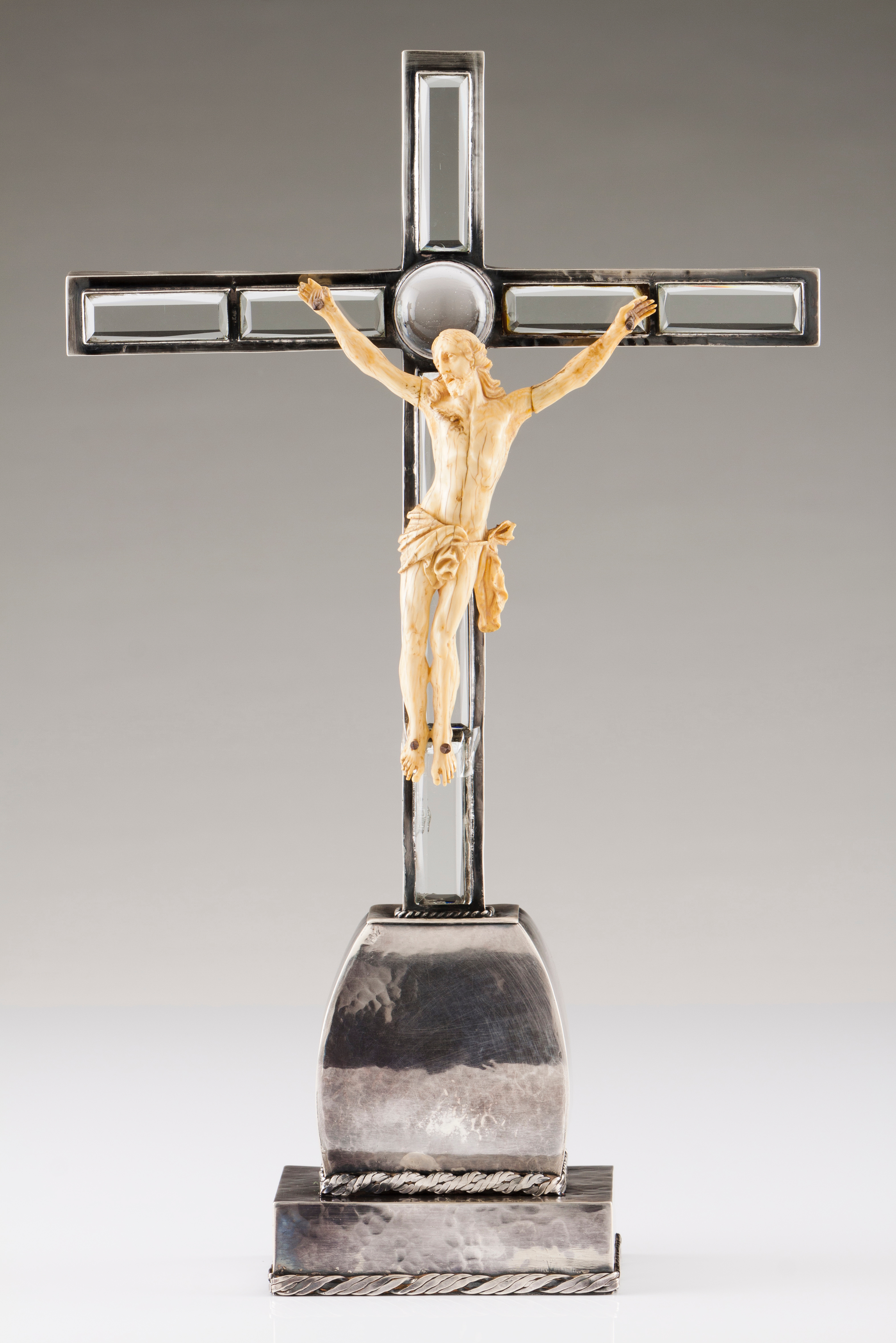 Cristo em marfim, cruz em prata inglesa com aplicações em vidro lapidado
