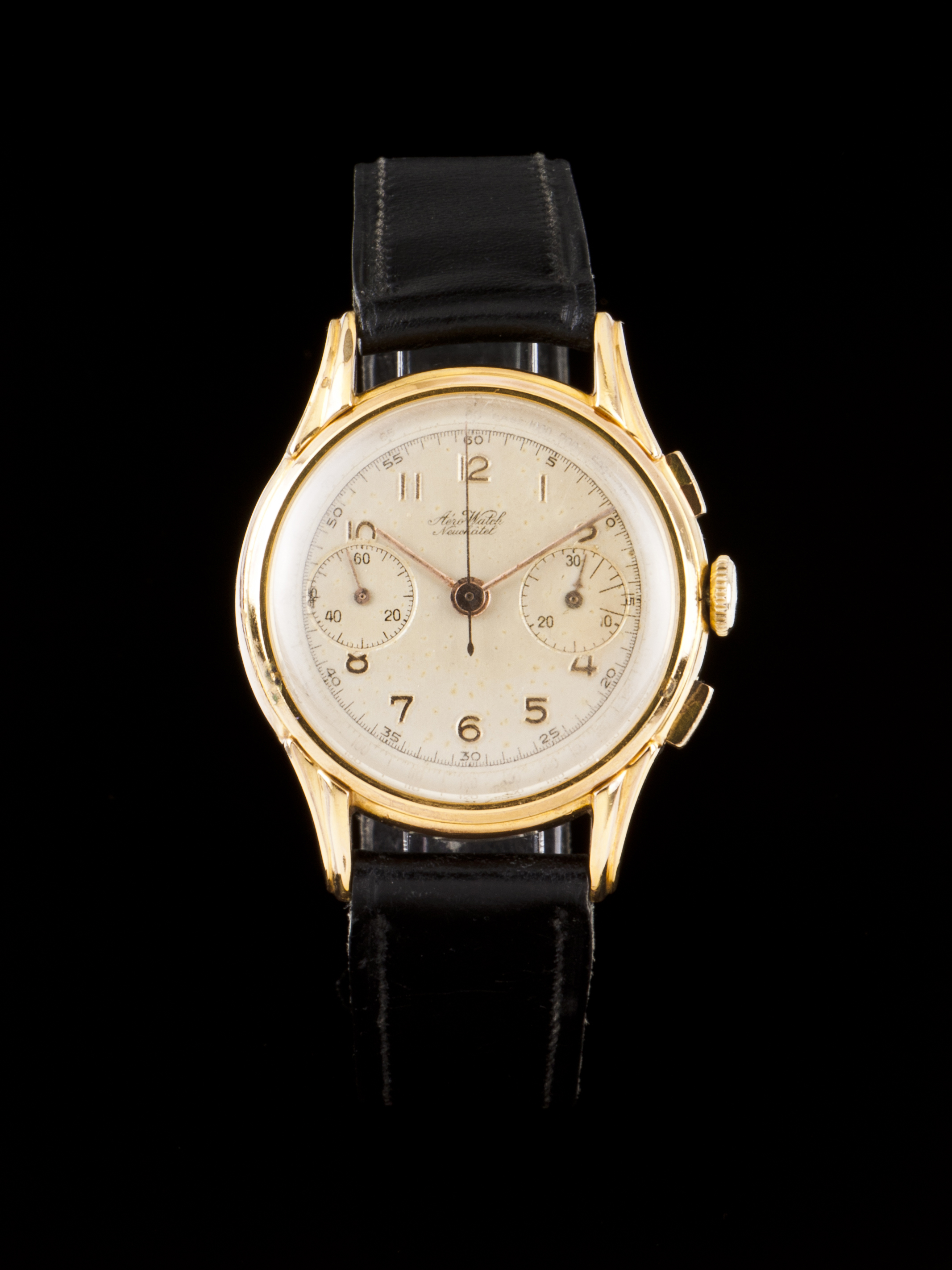 Relógio Aero Watch Neuchâtel com caixa em plaque com 35mm de diâmetro e invulgares asas. Movimento mecânico de corda manual com função de cronógrafo cal Landeron. Peça sem restauros.