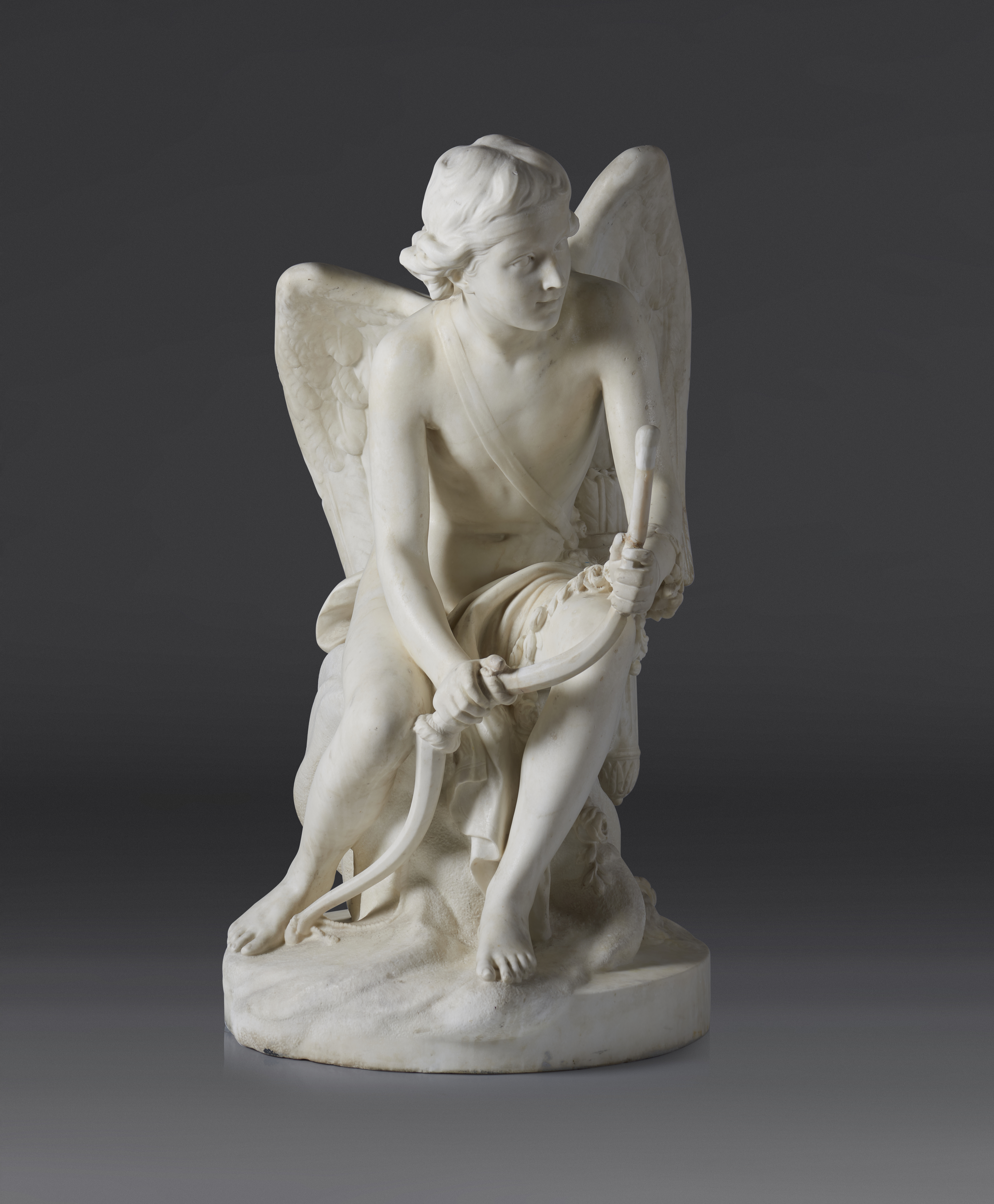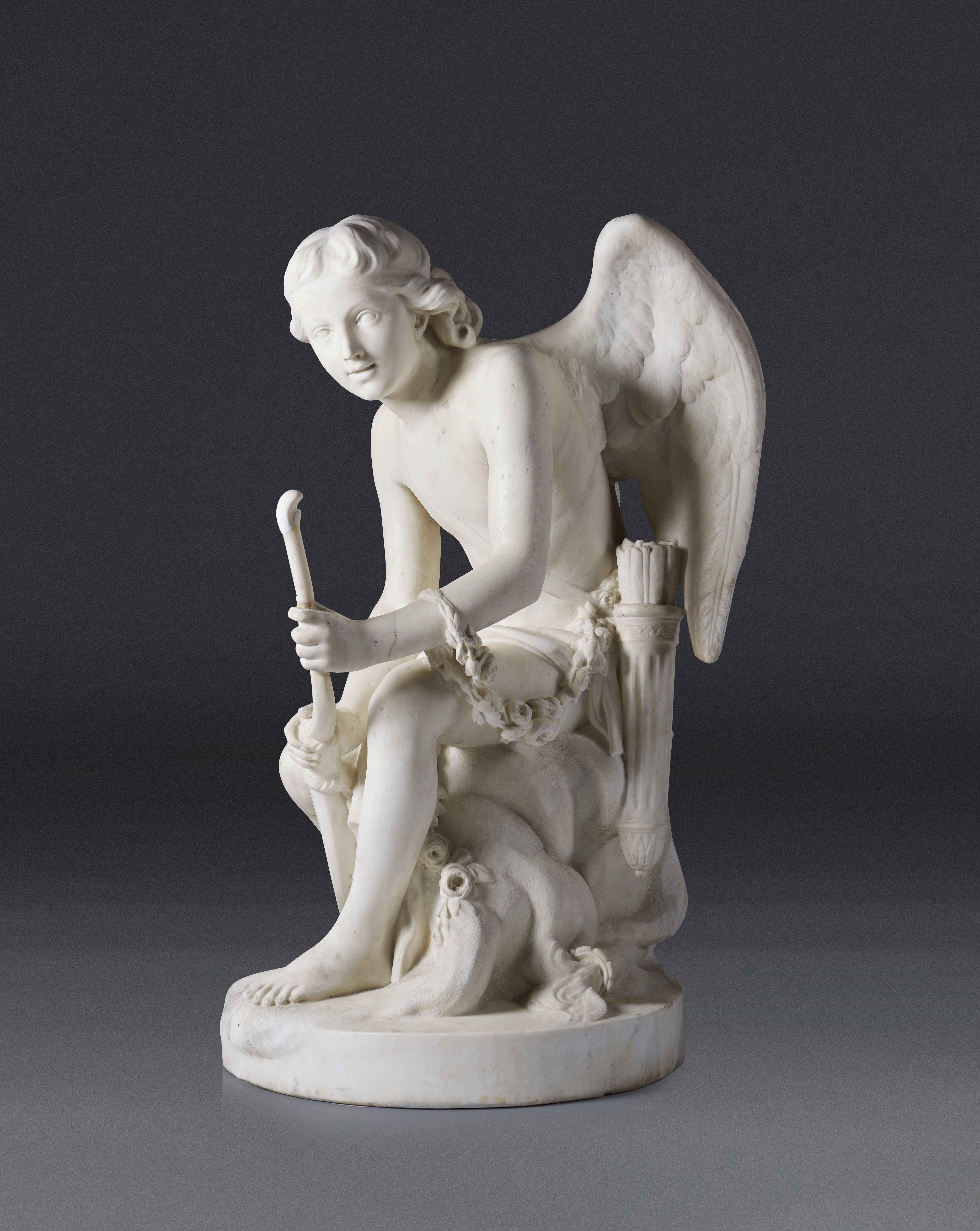 Figura mitológica alada representada na adolescência, sentado numa rocha rodeado por grinaldas de flores, uma aljava de flechas à cintura, na mão um arco e aos pés uma tocha flamejante