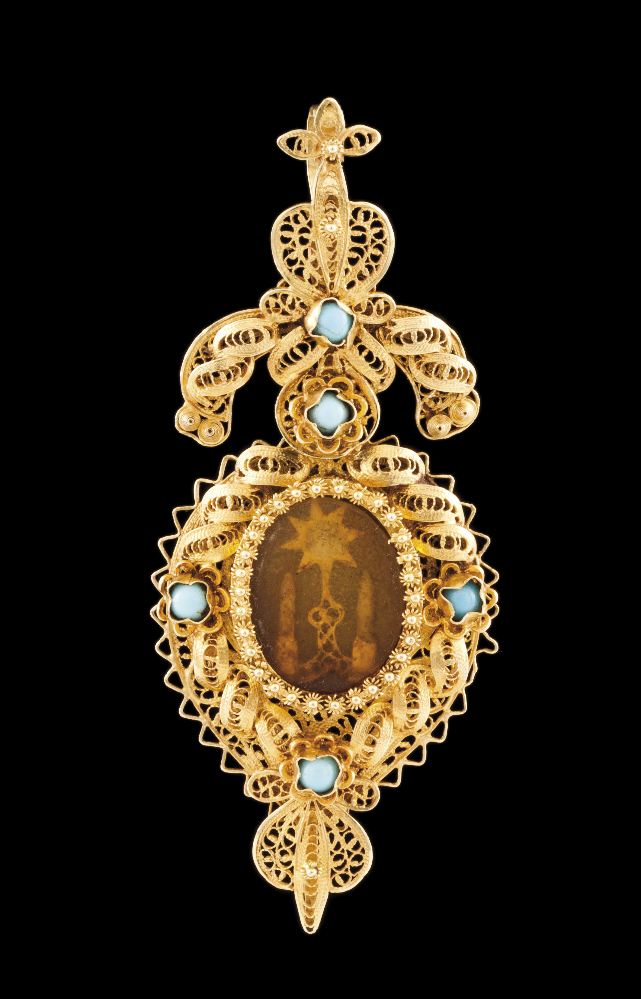 Pendente em filigrana de ouro cravejado com contas de porcelana azul