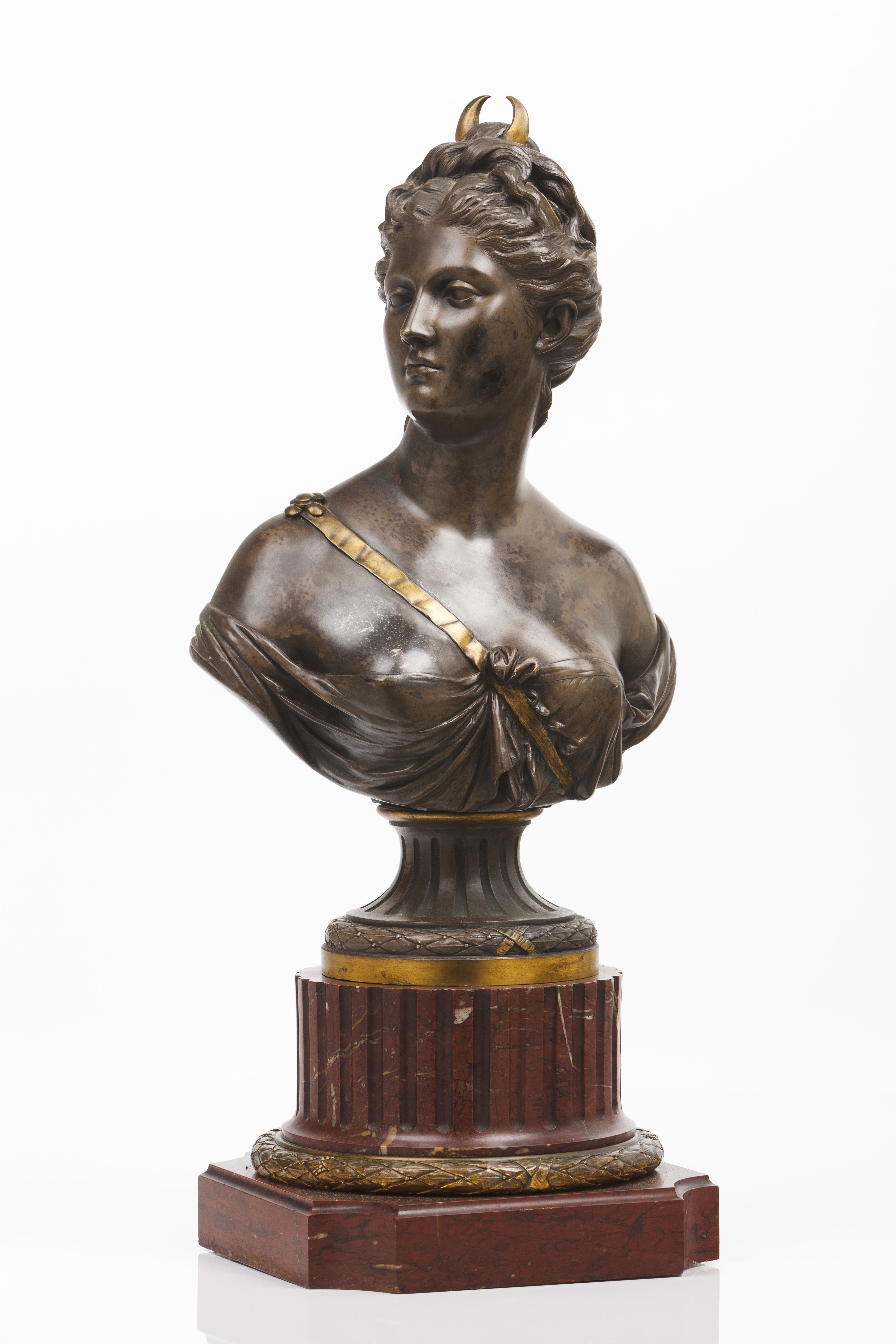 Escultura em bronze patinado com base em pedra mármore