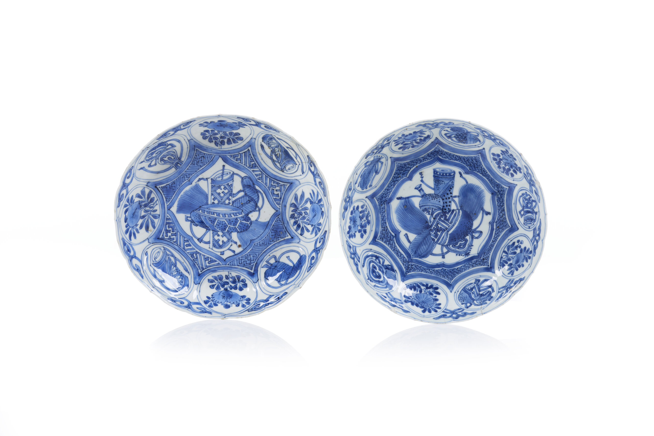 Decoração a azul sob vidrado, com composição central de objectos auspiciosos, incluindo guqin, rolos e flores, rodeados por faixa octogonal estilizada