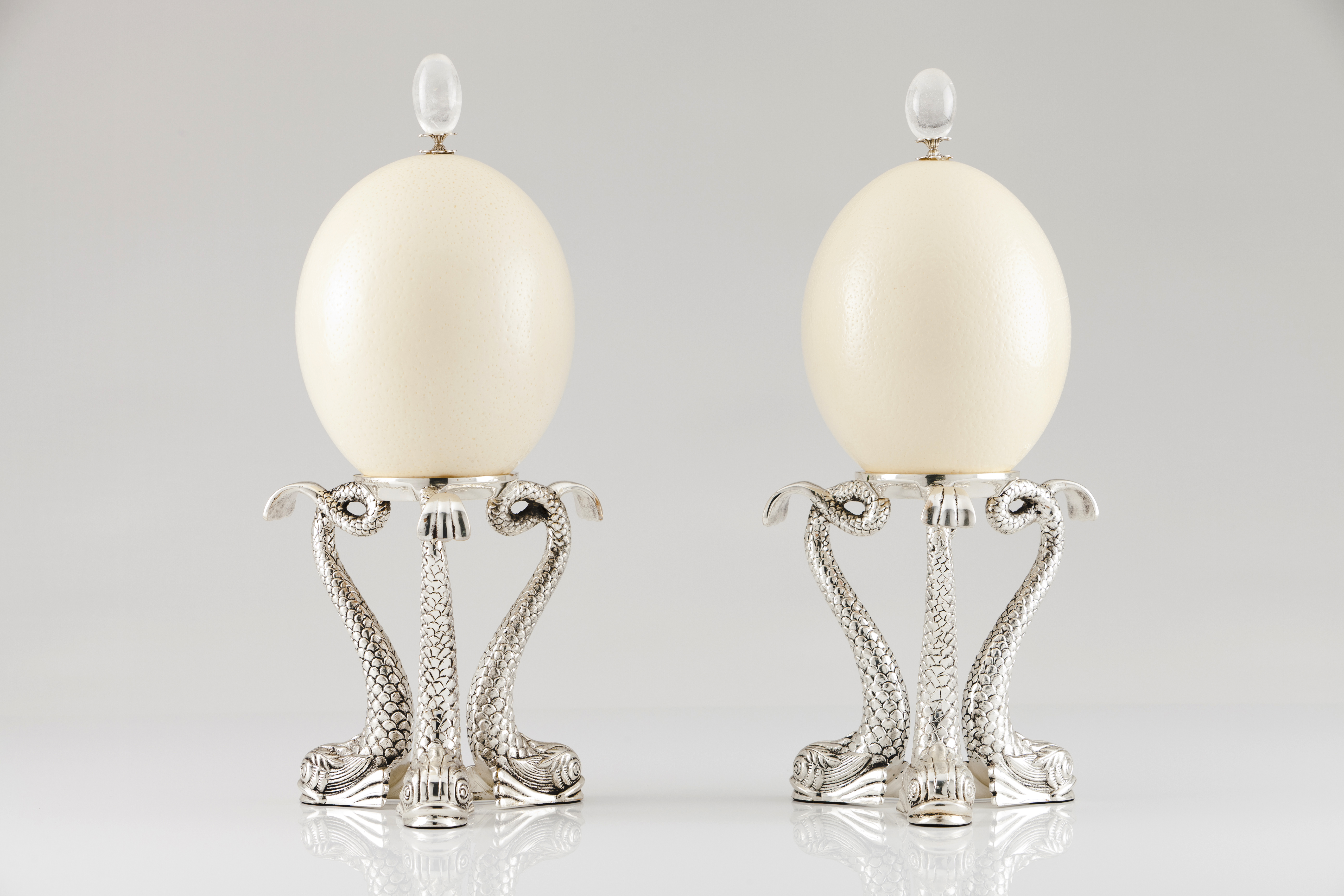 Base circular com 3 golfinhos em que assentam os ovos de avestruz com pomos circulares em cristal de rocha e flores em casquinha