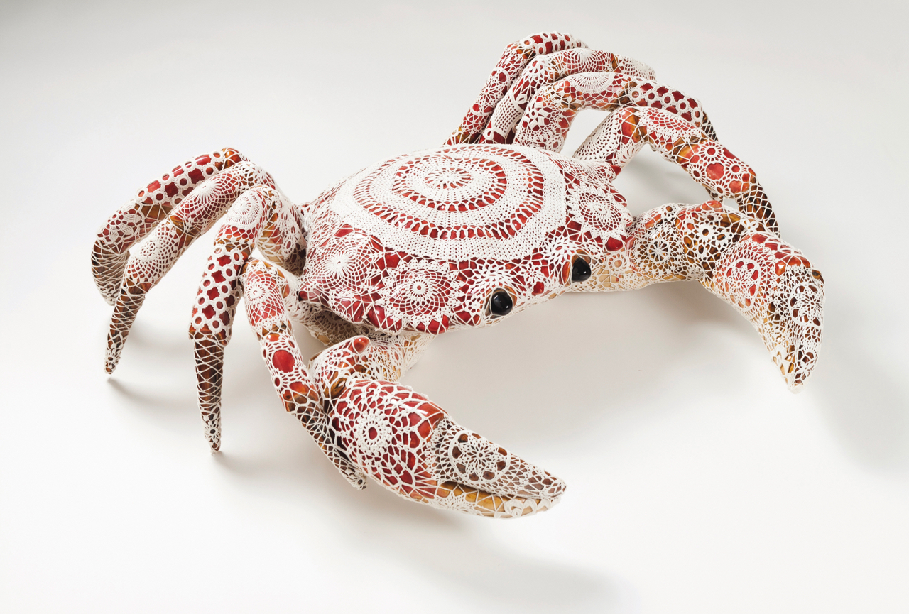 Escultura em faiança Rafael Bordalo Pinheiro pintada com vidrado cerâmico e croché em algodão feito à mão