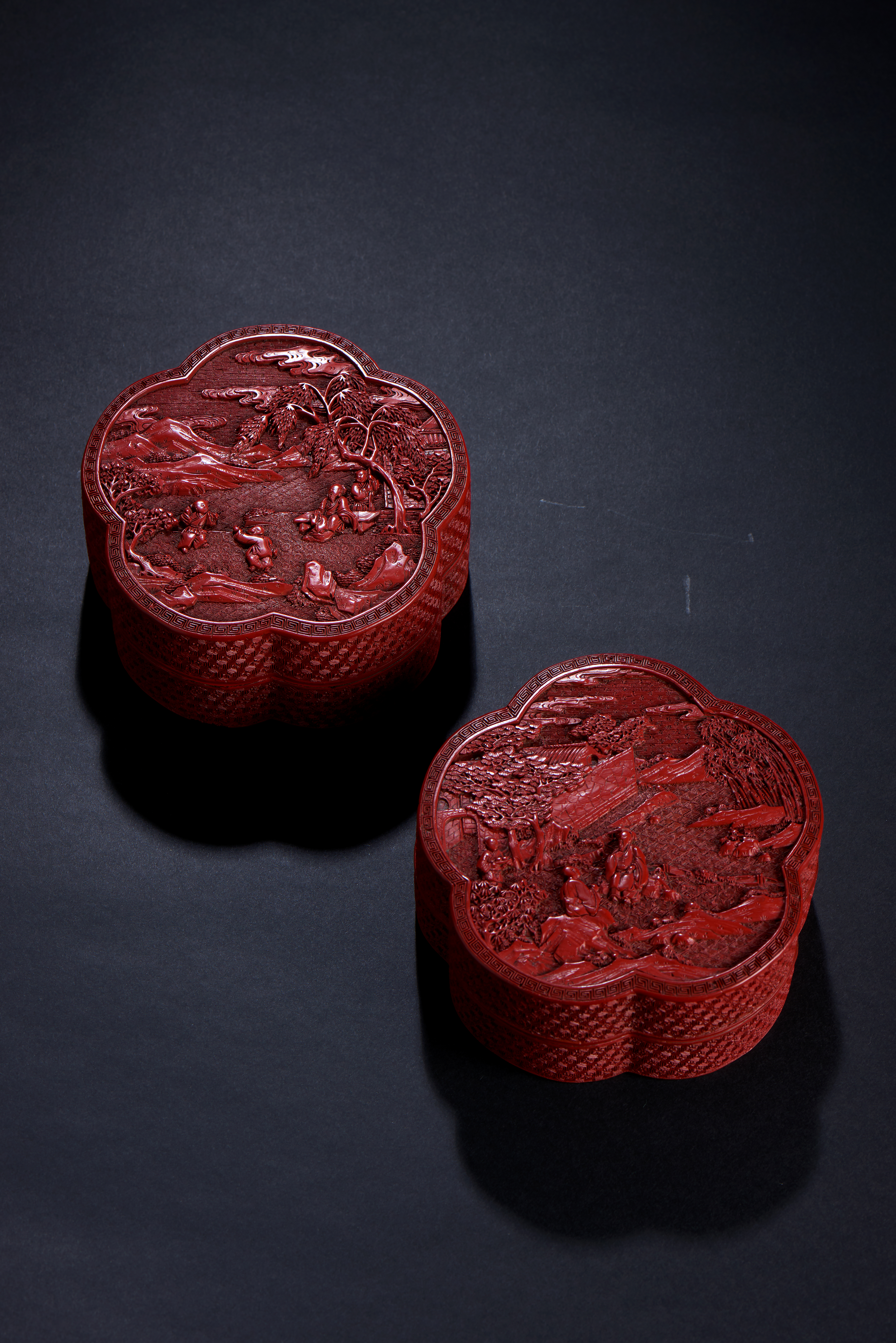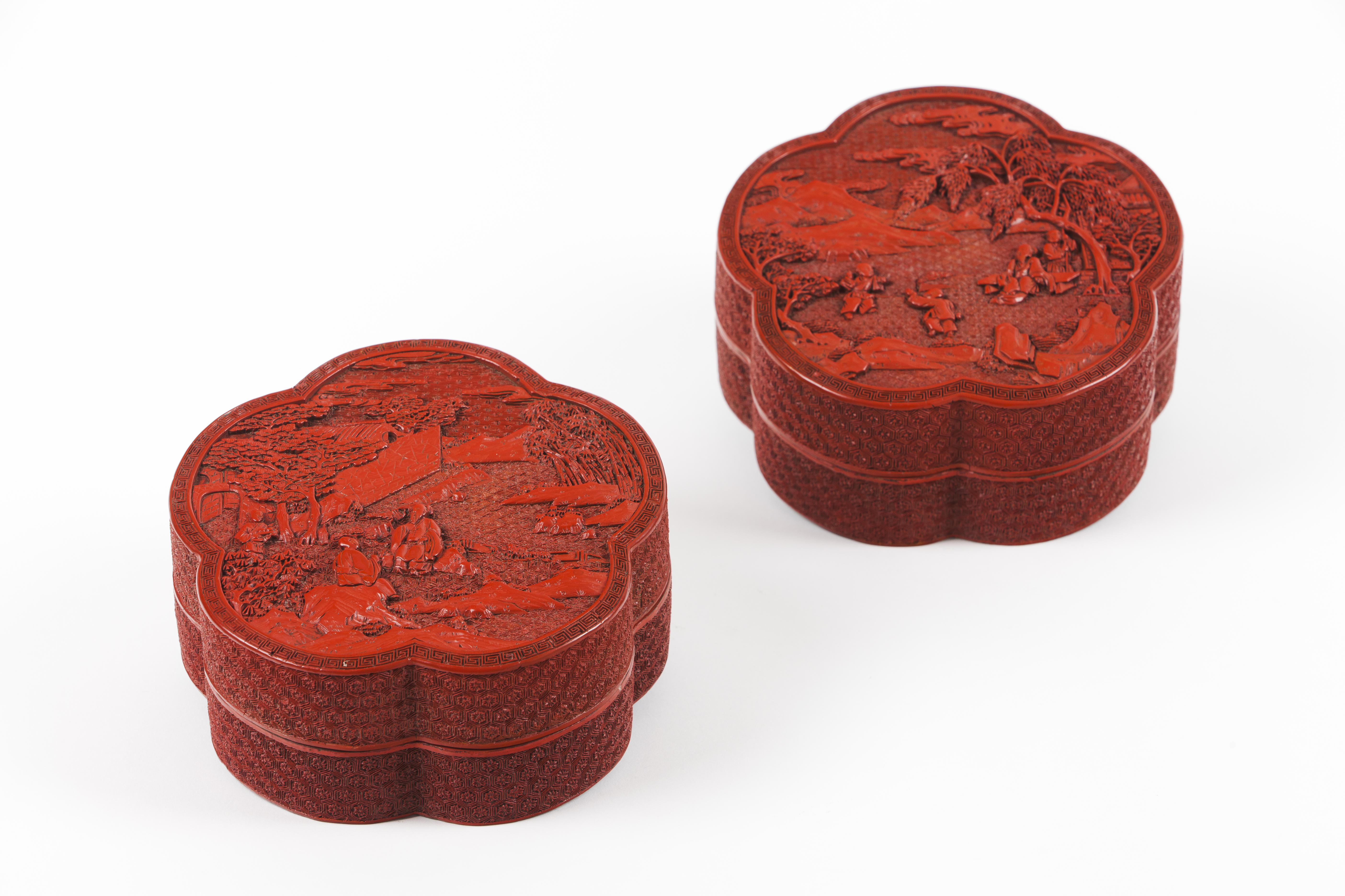 Ambas delicadamente esculpidas, representando nas tampas cenas idílicas em paisagens envoltas por cercaduras de ‘chave-grega’