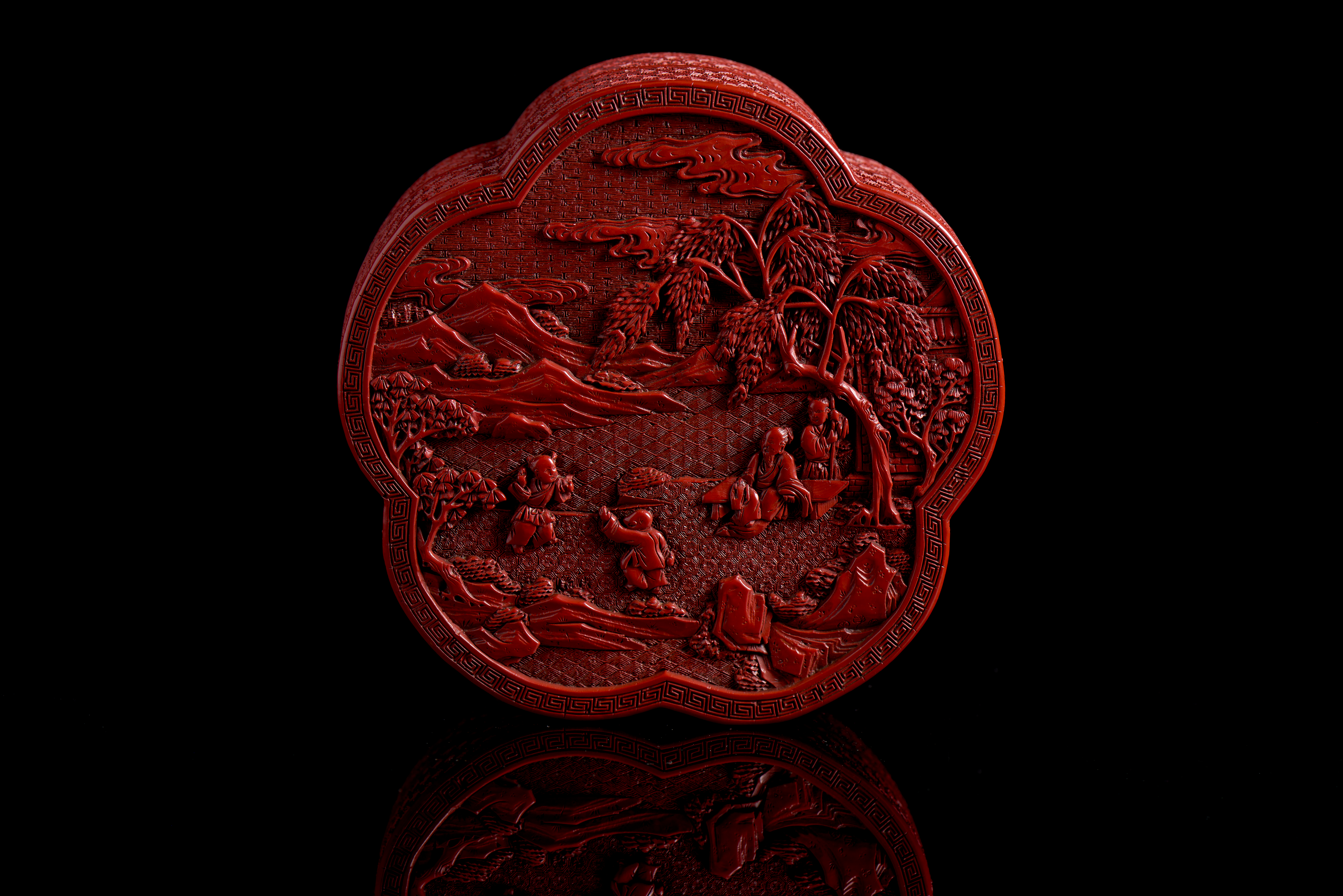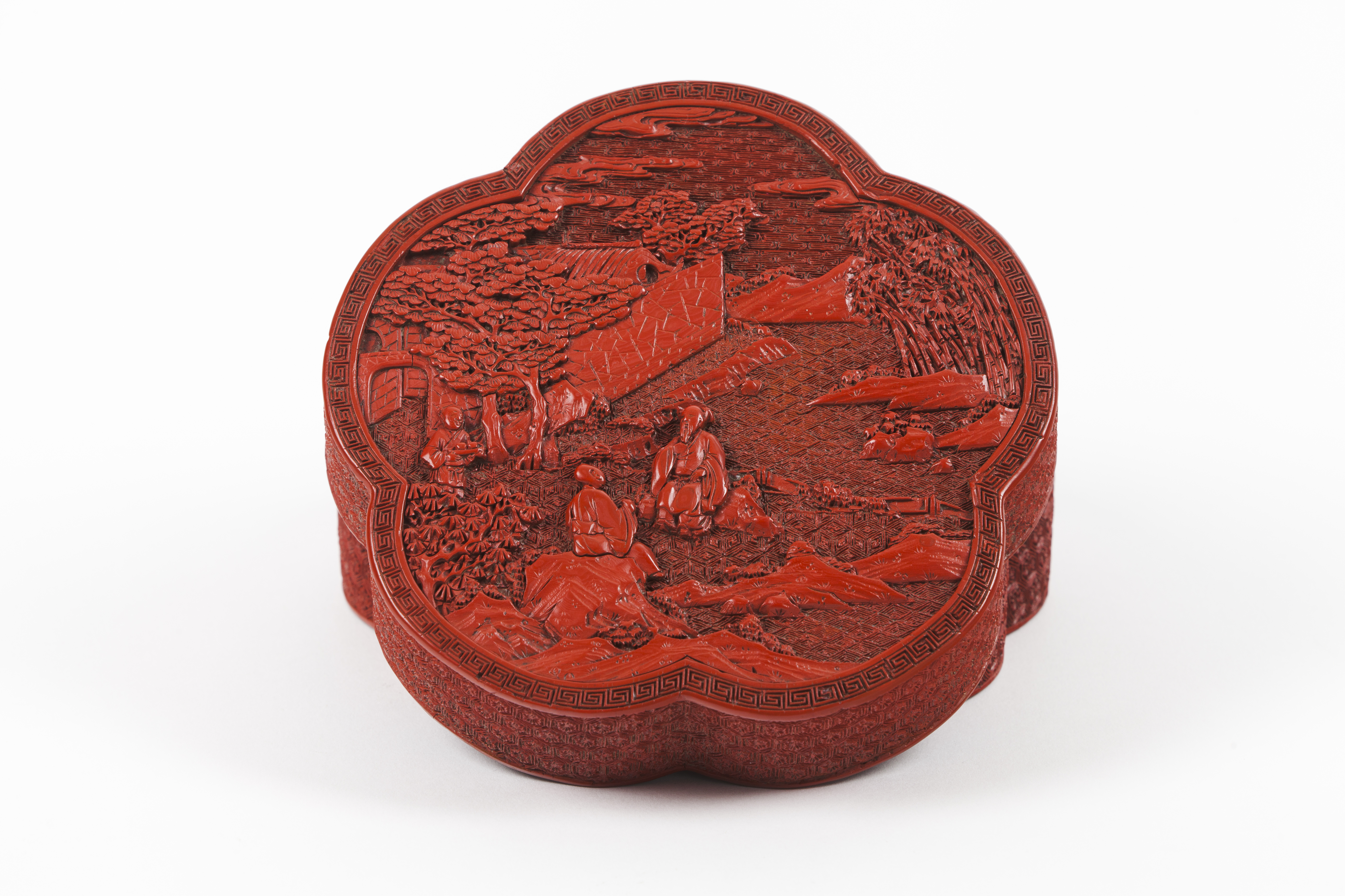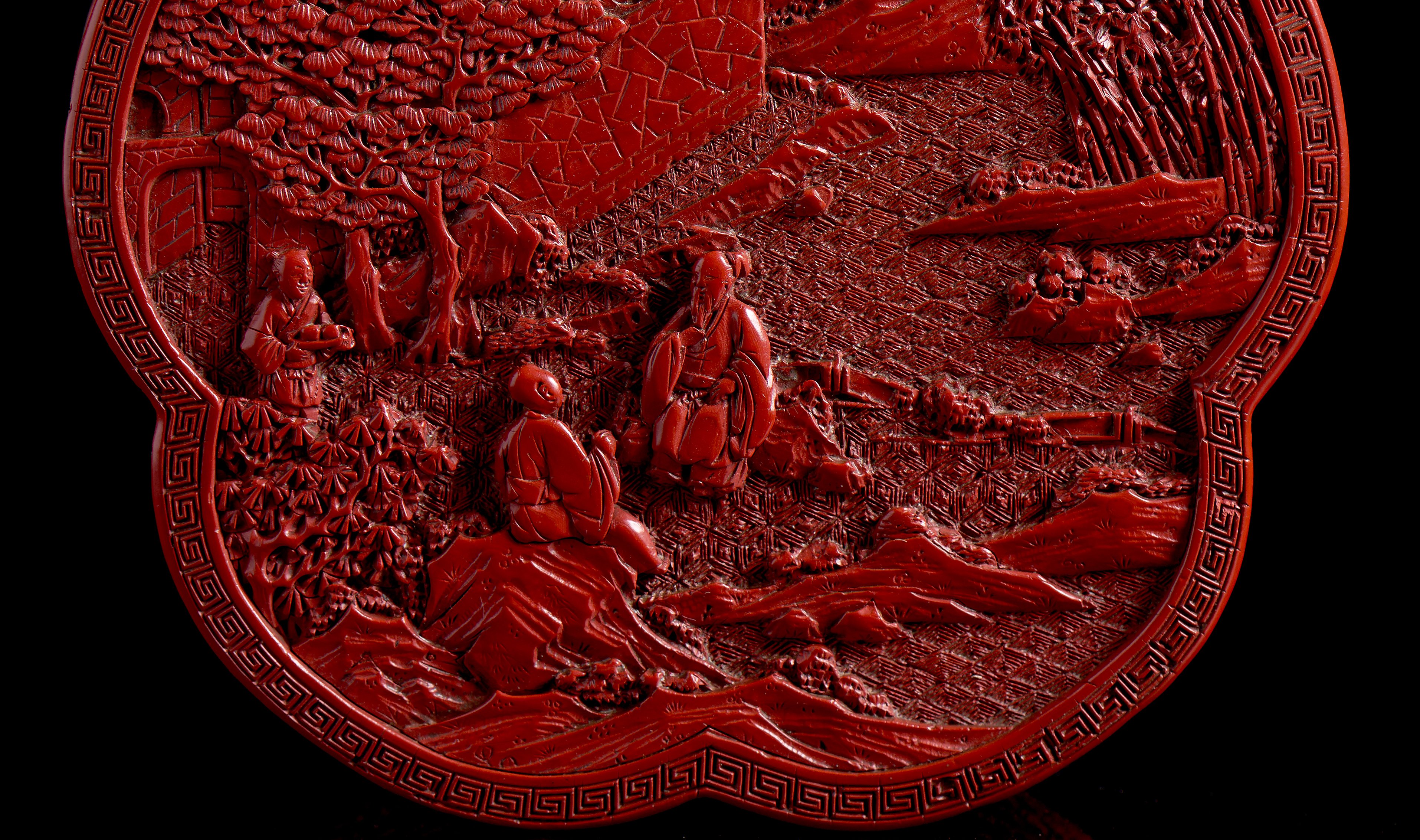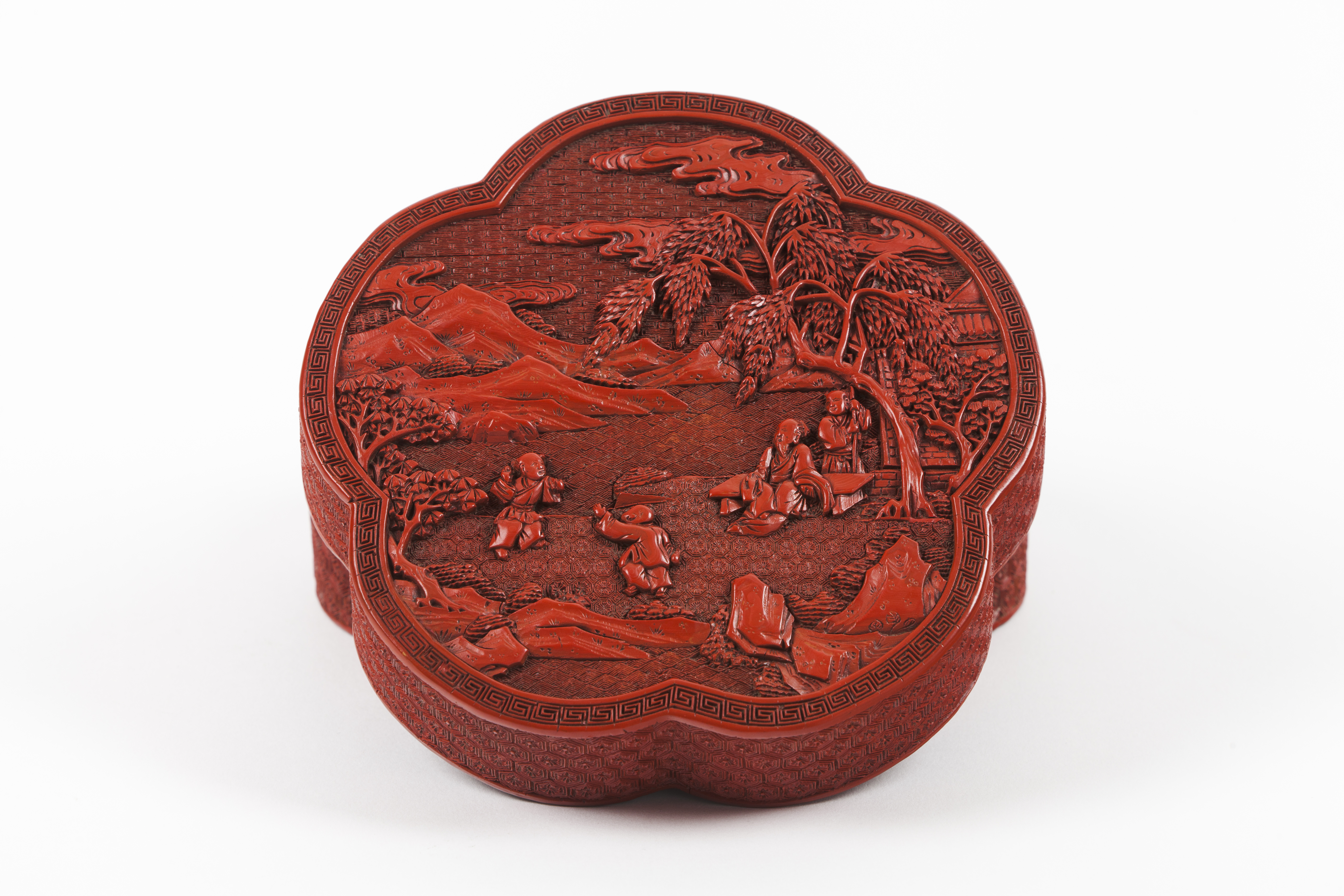 Numa das tampas, um erudito encontra-se sentado sob um salgueiro, acompanhado por um ajudante e a observar dois rapazes a brincar