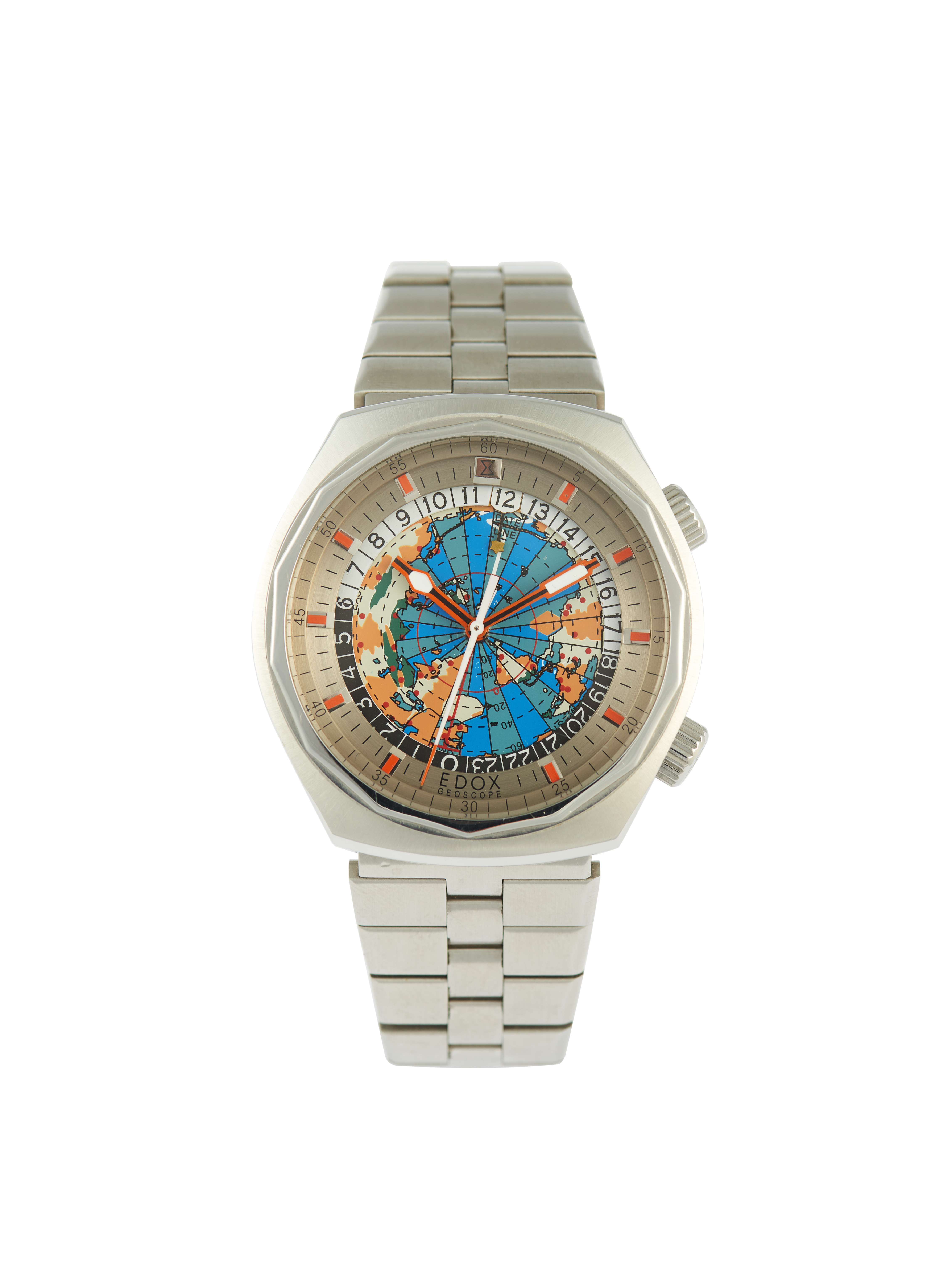 Modelo Geoscope. Movimento mecânico automático. Caixa e bracelete em aço. Em bom estado de conservação.