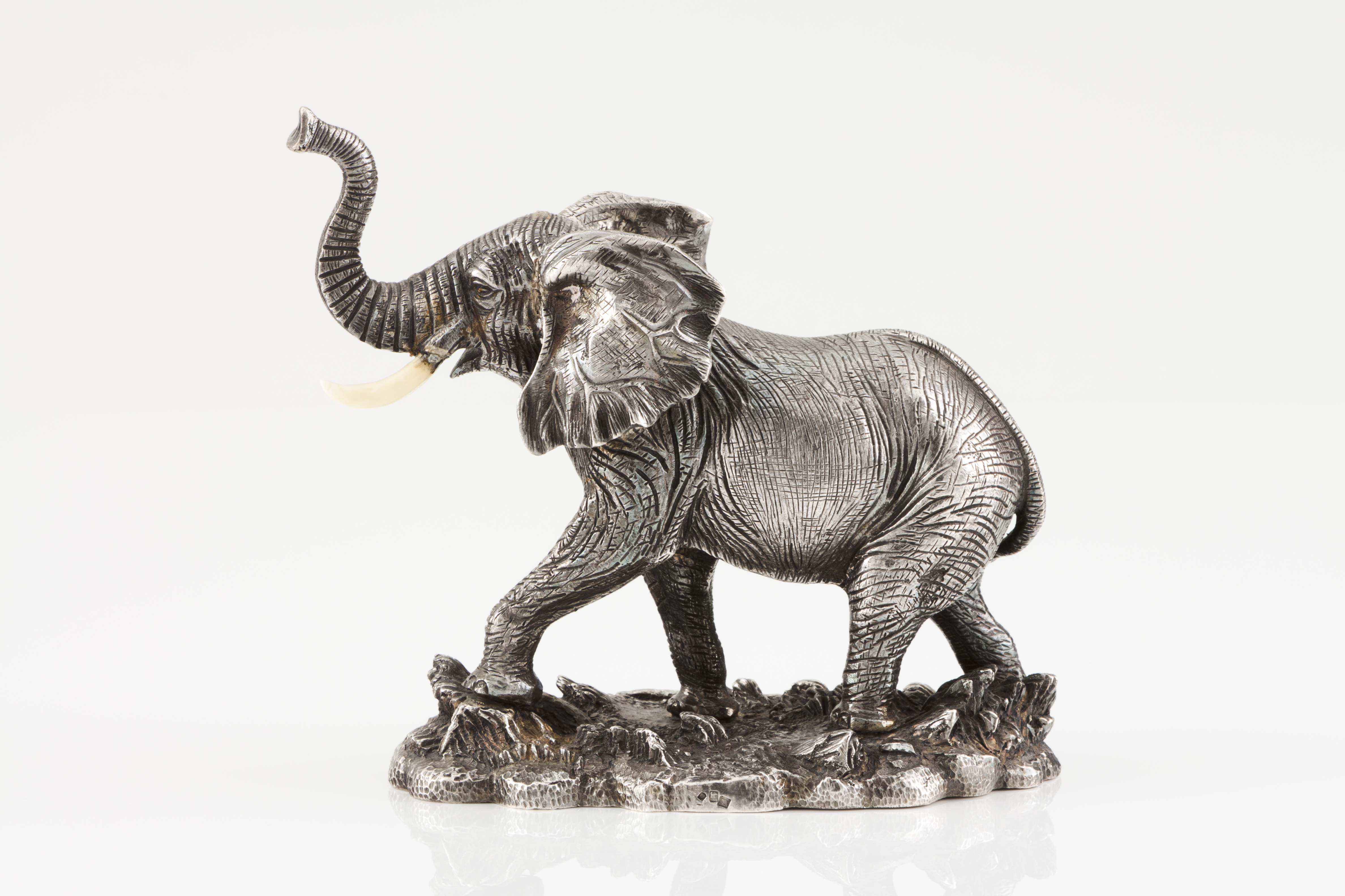 Escultura em vulto perfeito, representando elefante com tromba erguida e dentes em osso