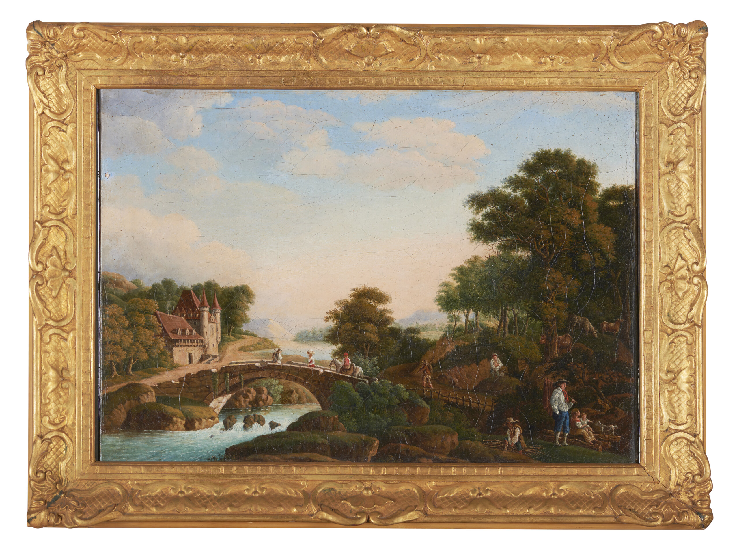 Paisagem com rio, castelo, ponte e figuras